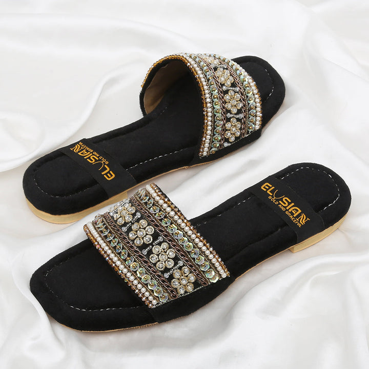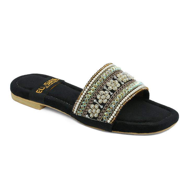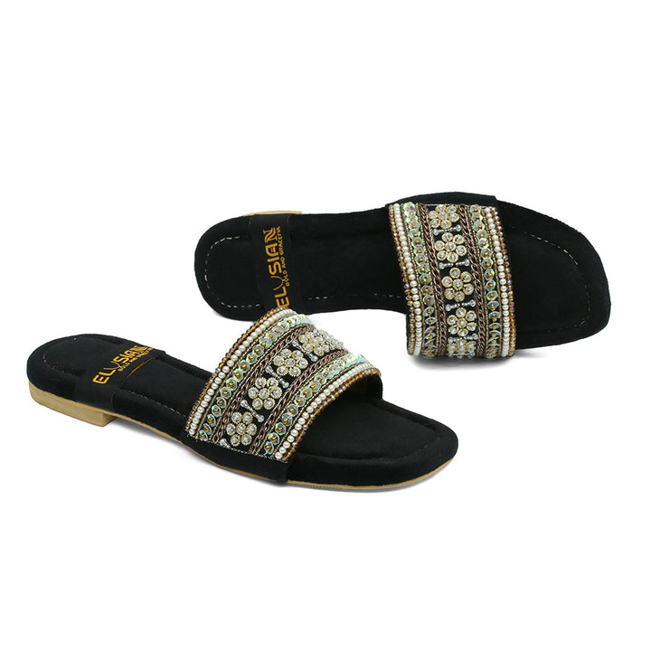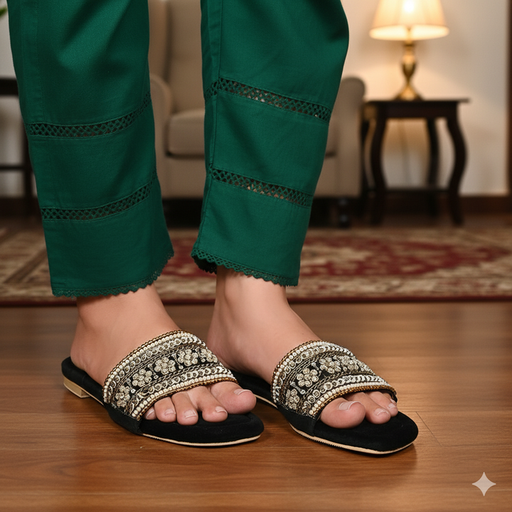 FL-AS1-Black represents a prime example of delightful, opulent, and time-honored craftsmanship showcased in elegant flats adorned with exquisite handmade detailing. These flats stand as cherished cultural legacies of Pakistan, meticulously stitched by dedicated rural shoemakers to showcase the unparalleled beauty of captivating feet.