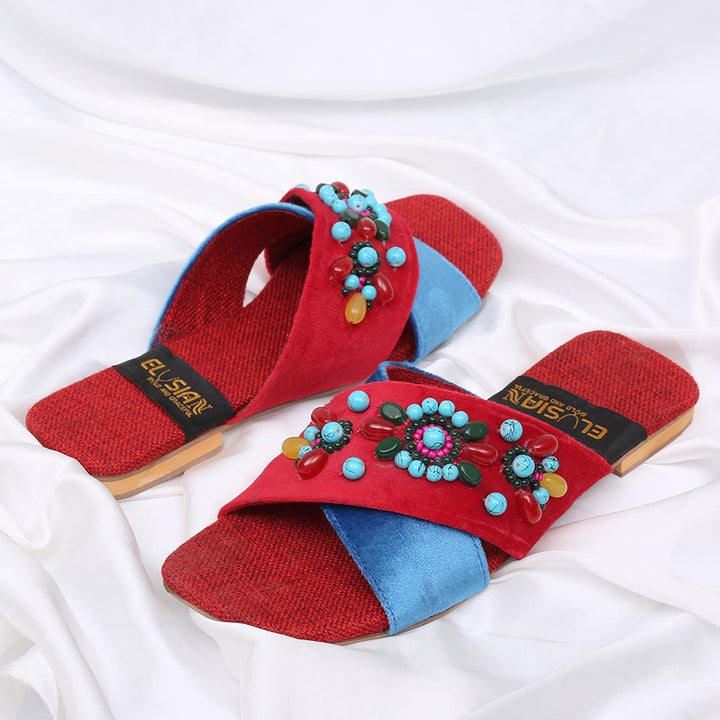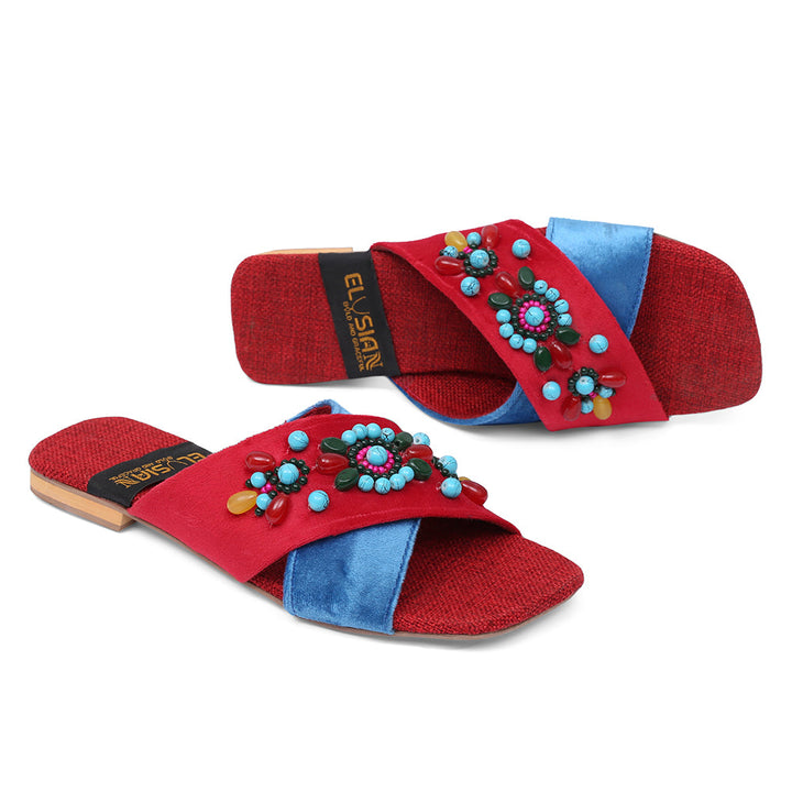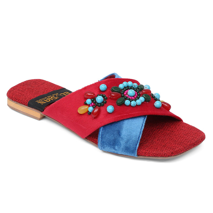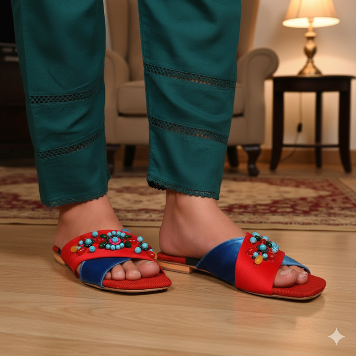 FL-H1-Red represents a prime example of delightful, opulent, and time-honored craftsmanship showcased in elegant flats adorned with exquisite handmade detailing. These flats stand as cherished cultural legacies of Pakistan, meticulously stitched by dedicated rural shoemakers to showcase the unparalleled beauty of captivating feet.