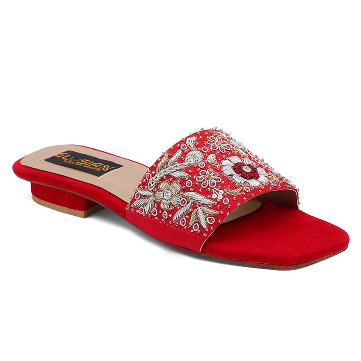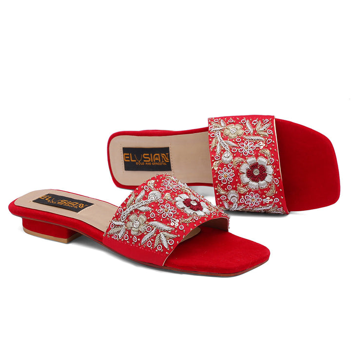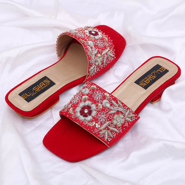 FL-KH1-Red represents a prime example of delightful, opulent, and time-honored craftsmanship showcased in elegant flats adorned with exquisite handmade detailing. These flats stand as cherished cultural legacies of Pakistan, meticulously stitched by dedicated rural shoemakers to showcase the unparalleled beauty of captivating feet.