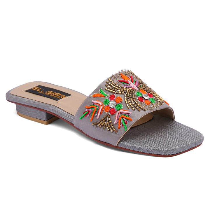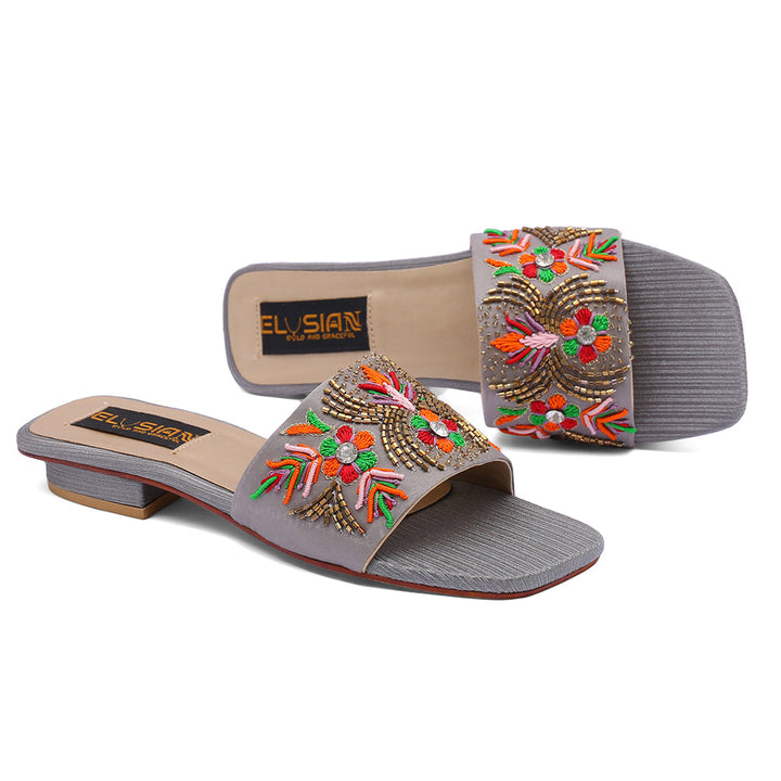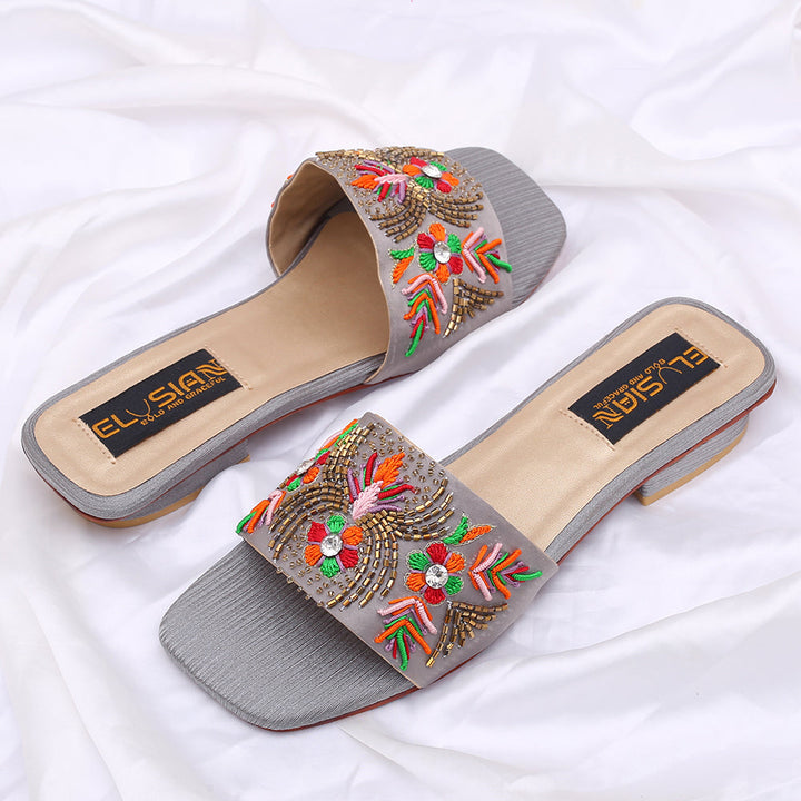 FL-KH2-Grey represents a prime example of delightful, opulent, and time-honored craftsmanship showcased in elegant flats adorned with exquisite handmade detailing. These flats stand as cherished cultural legacies of Pakistan, meticulously stitched by dedicated rural shoemakers to showcase the unparalleled beauty of captivating feet.