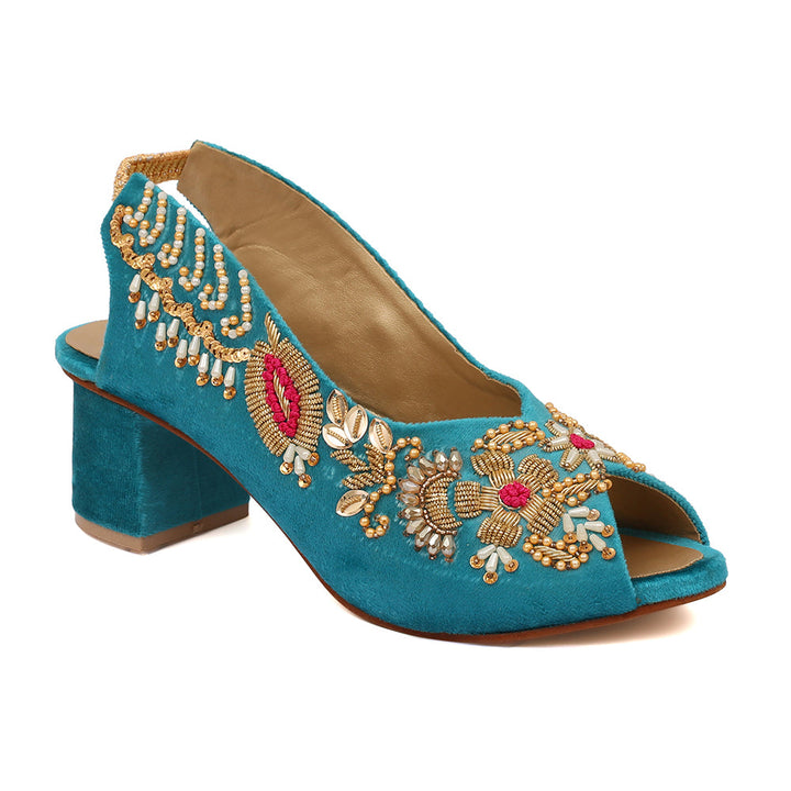 These open-toe platform wedges are meticulously crafted from exquisite ivory velvet, showcasing beautiful embroidery detailing across the shoe. The shoes are adorned with a removable, dainty ankle strap.