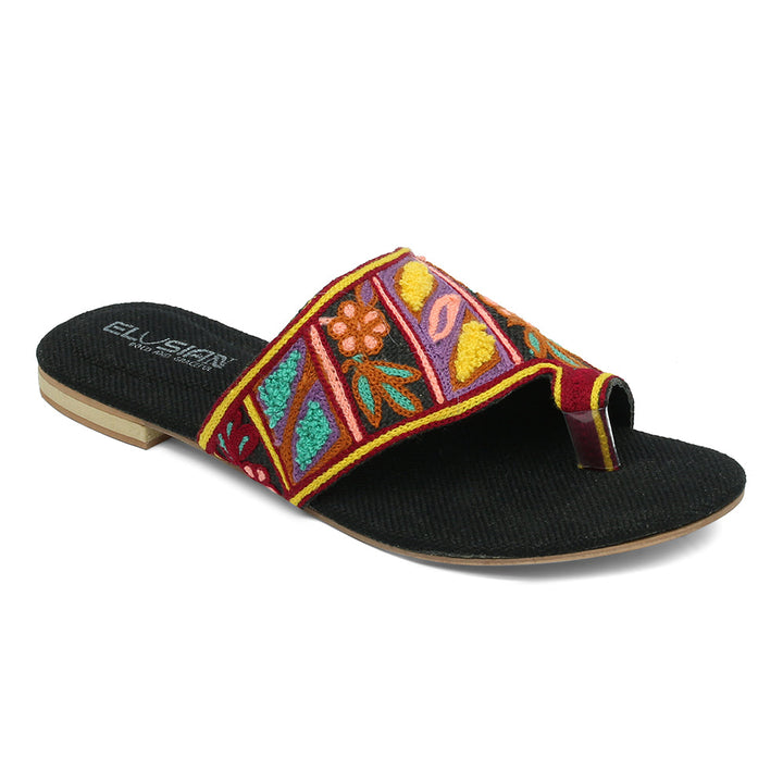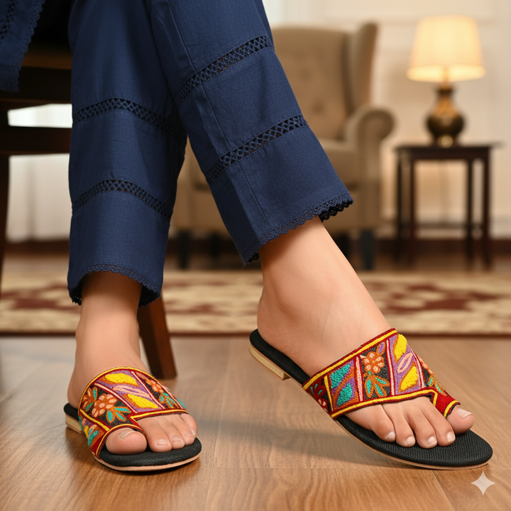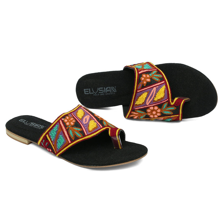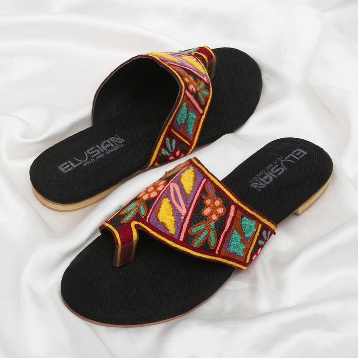 FL-SJ11-Black represents a prime example of delightful, opulent, and time-honored craftsmanship showcased in elegant flats adorned with exquisite machine embroidery. These flats stand as cherished cultural legacies of Pakistan, meticulously stitched by dedicated rural shoemakers to showcase the unparalleled beauty of captivating feet.