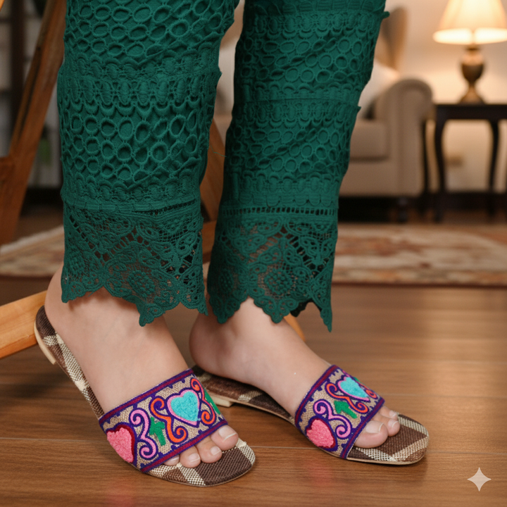 FL-SJ4-Fawn represents a prime example of delightful, opulent, and time-honored craftsmanship showcased in elegant flats adorned with exquisite embroidery detailing. These flats stand as cherished cultural legacies of Pakistan, meticulously stitched by dedicated rural shoemakers to showcase the unparalleled beauty of captivating feet.