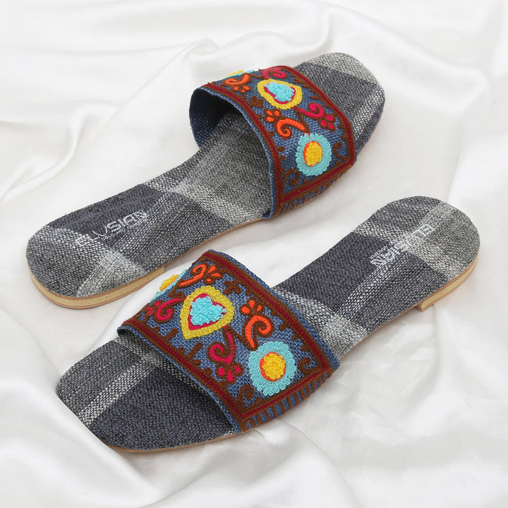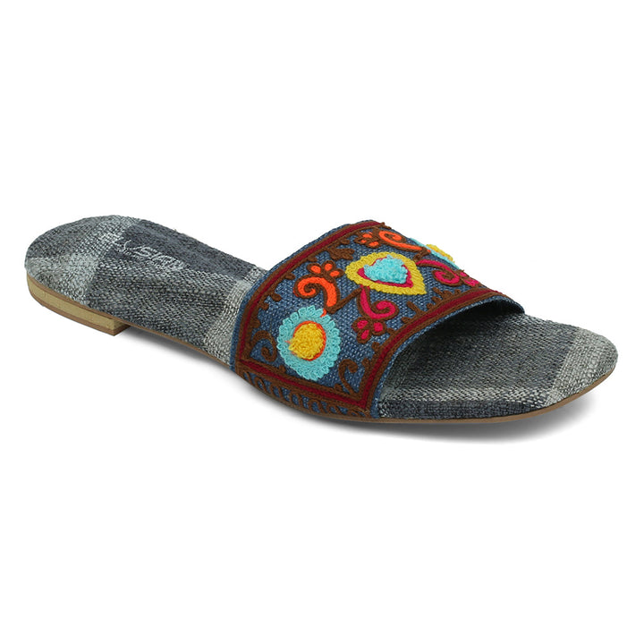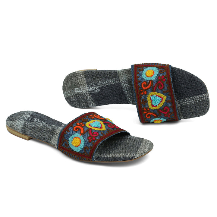 FL-SJ7-Denim represents a prime example of delightful, opulent, and time-honored craftsmanship showcased in elegant flats adorned with exquisite machine embroidery detailing. These flats stand as cherished cultural legacies of Pakistan, meticulously stitched by dedicated rural shoemakers to showcase the unparalleled beauty of captivating feet.