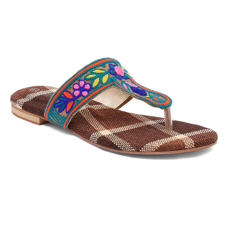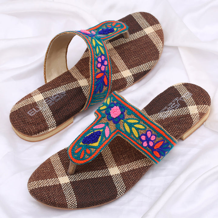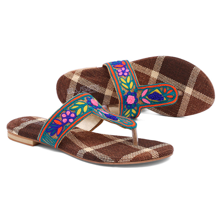 FL-SJ9-Brown represents a prime example of delightful, opulent, and time-honored craftsmanship showcased in elegant flats adorned with exquisite machine embroidery. These flats stand as cherished cultural legacies of Pakistan, meticulously stitched by dedicated rural shoemakers to showcase the unparalleled beauty of captivating feet.