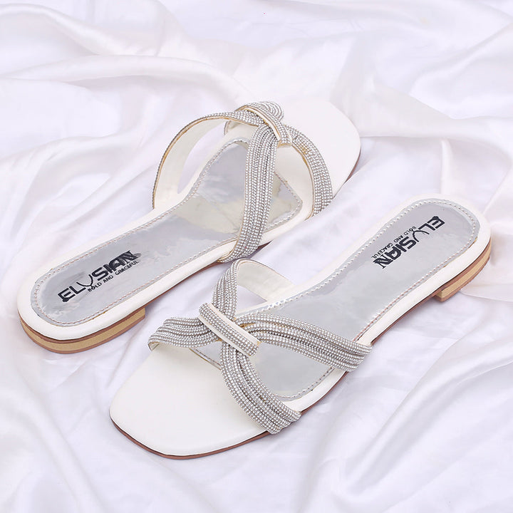 FL-SQ5-Off-White represents a prime example of delightful, opulent, and time-honored craftsmanship showcased in elegant flats adorned with exquisite mesh detailing. These flats stand as cherished cultural legacies of Pakistan, meticulously stitched by dedicated rural shoemakers to showcase the unparalleled beauty of captivating feet.