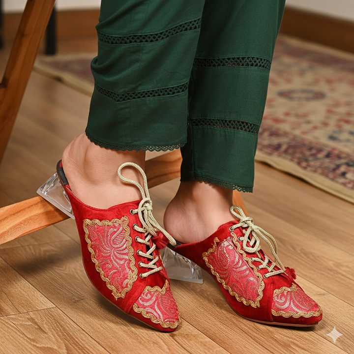 Explore the irresistible allure of Elysian's Jogger Mules! These remarkable mules effortlessly blend opulence and heritage, featuring vibrant exotic designs inspired by Pakistan's rich cultural tapestry. Crafted with precision by talented rural artisans, each pair reflects meticulous artistry, enhancing the natural grace of your feet. Elevate your fashion statement with sophistication and cultural flair with our Jogger Mules!, a must-have for your seasonal closet.