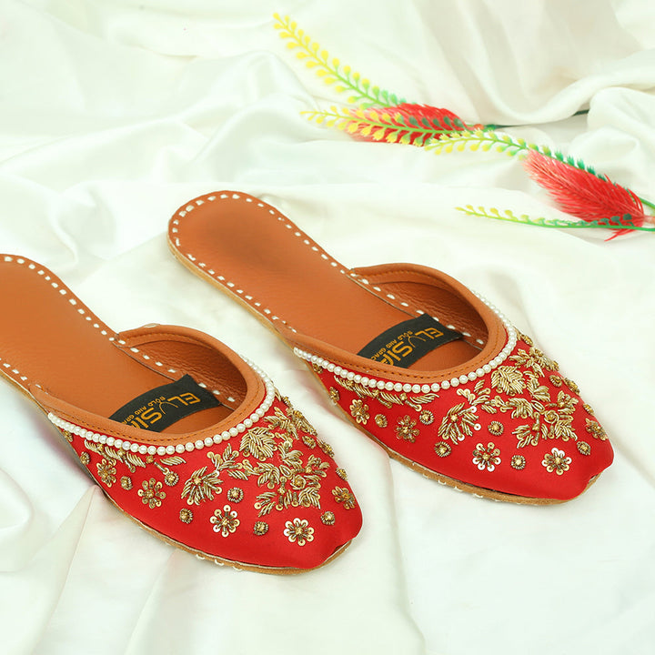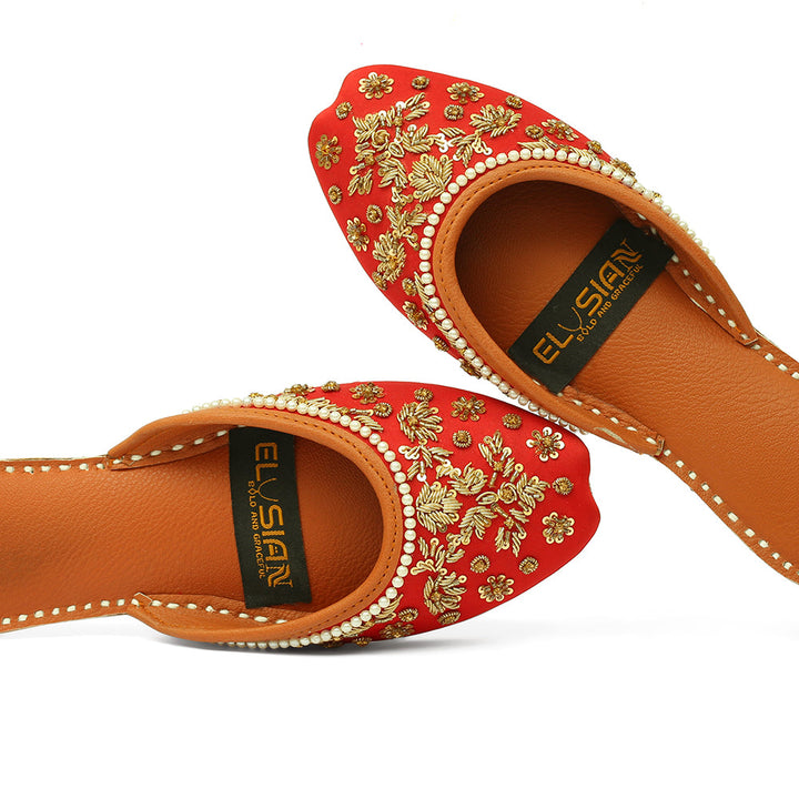 Jutti-IB2-Red epitomizes a delightful, opulent, and classic craftsmanship crafted on a rich red foundation, featuring exquisite handmade detailing. These charming creations represent the rich heritage of Pakistan, meticulously hand-sewn by skilled artisans from rural areas, showcasing the unparalleled beauty of captivating footwear.