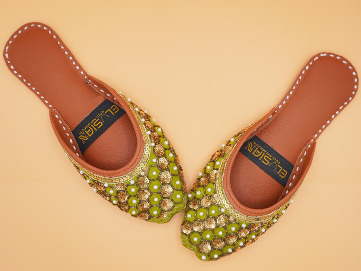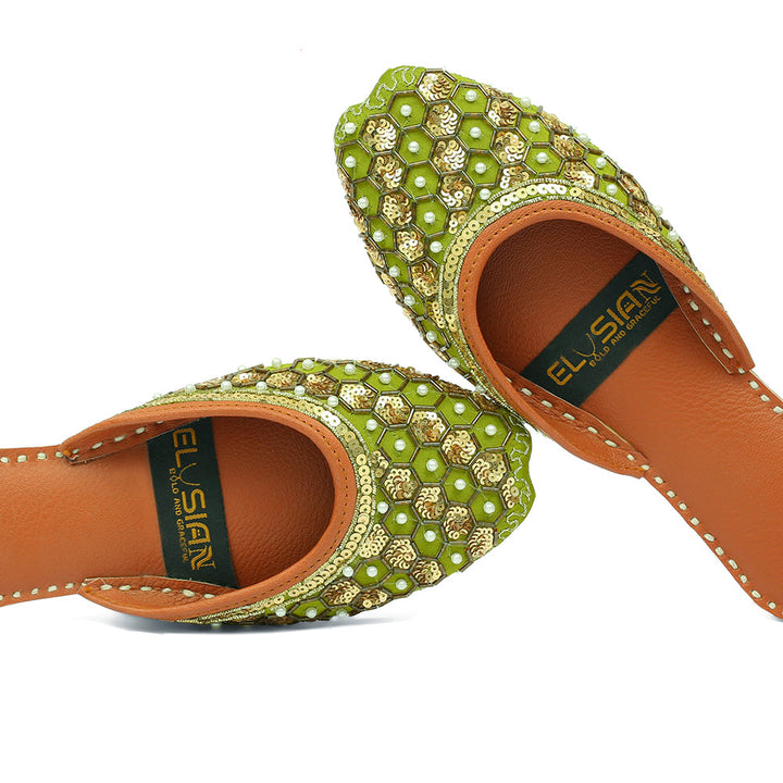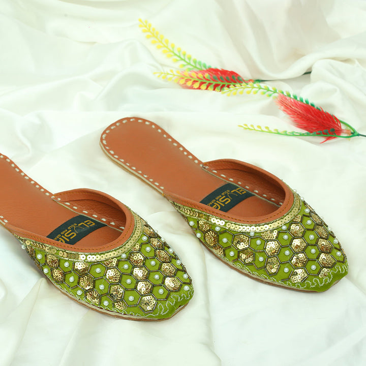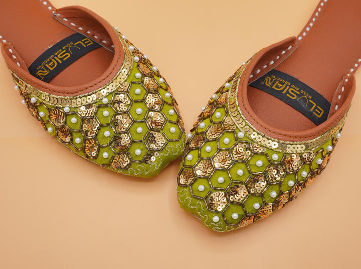Jutti-M2-Green epitomizes a delightful, opulent, and classic craftsmanship crafted on a green foundation, featuring exquisite handmade detailing. These charming creations represent the rich heritage of Pakistan, meticulously hand-sewn by skilled artisans from rural areas, showcasing the unparalleled beauty of captivating footwear.