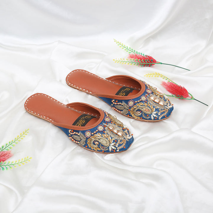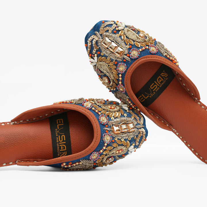 Jutti-Q1-Blue epitomizes a delightful, opulent, and classic craftsmanship crafted on a blue foundation, featuring exquisite handmade detailing. These charming creations represent the rich heritage of Pakistan, meticulously hand-sewn by skilled artisans from rural areas, showcasing the unparalleled beauty of captivating footwear.
