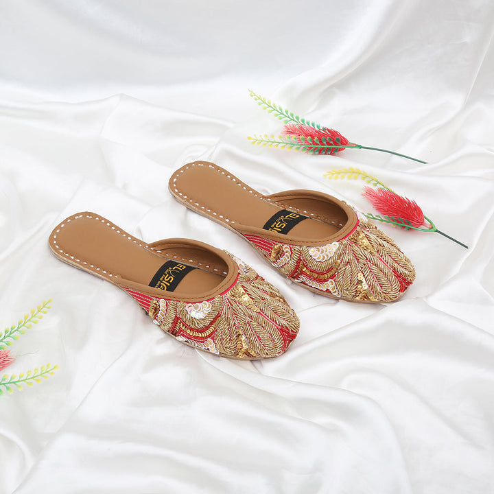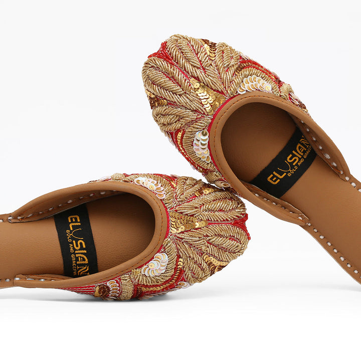 Jutti-SA1-Red epitomizes a delightful, opulent, and classic craftsmanship crafted on a red foundation, featuring exquisite handmade detailing. These charming creations represent the rich heritage of Pakistan, meticulously hand-sewn by skilled artisans from rural areas, showcasing the unparalleled beauty of captivating footwear.