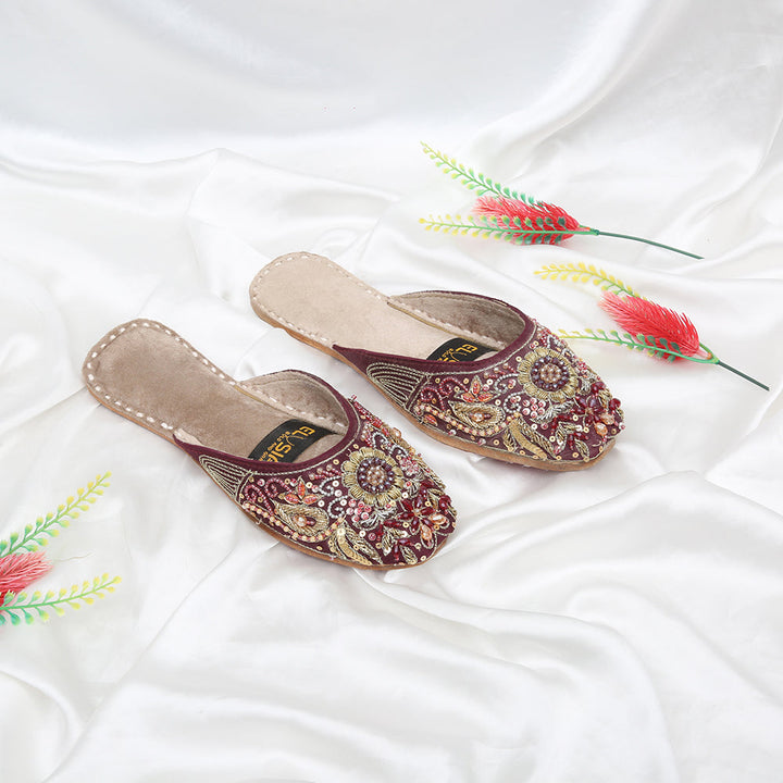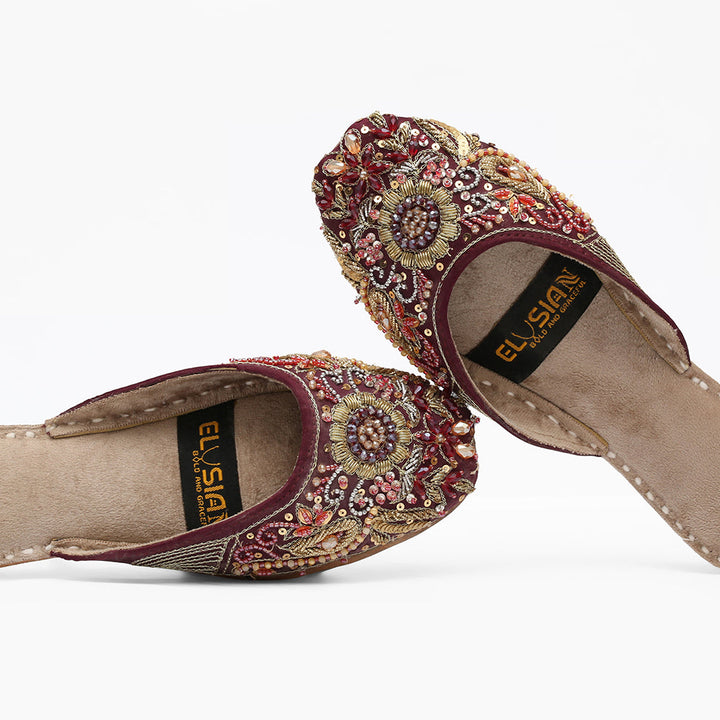 Jutti-SA4-Maroon epitomizes a delightful, opulent, and classic craftsmanship crafted on a maroon foundation, featuring exquisite handmade detailing. These charming creations represent the rich heritage of Pakistan, meticulously hand-sewn by skilled artisans from rural areas, showcasing the unparalleled beauty of captivating footwear.