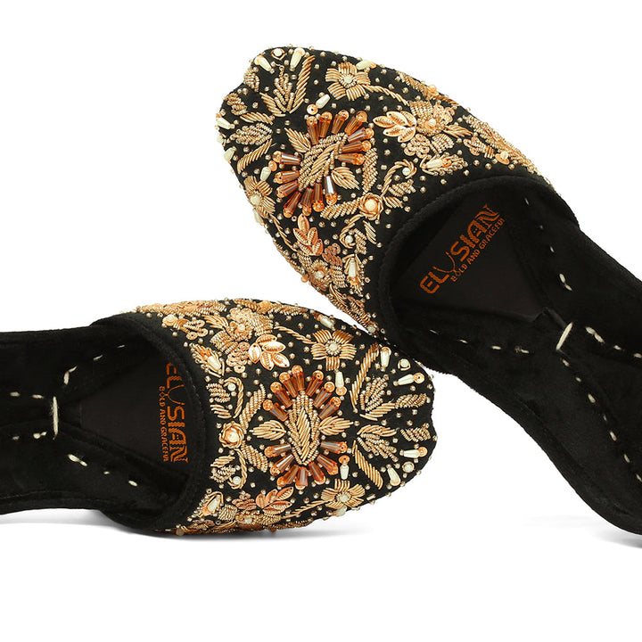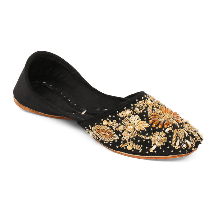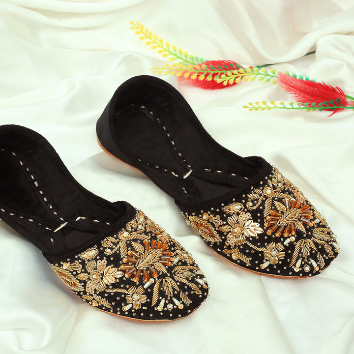 Khussa-AS4-Black perfectly embodies a harmonious blend of luxurious tradition and artistry, set against a captivating black backdrop and adorned with exquisite handcrafted details. These charming treasures, a testament to Pakistan’s heritage, are meticulously hand-sewn by dedicated rural artisans, showcasing the innate beauty of alluring feet.