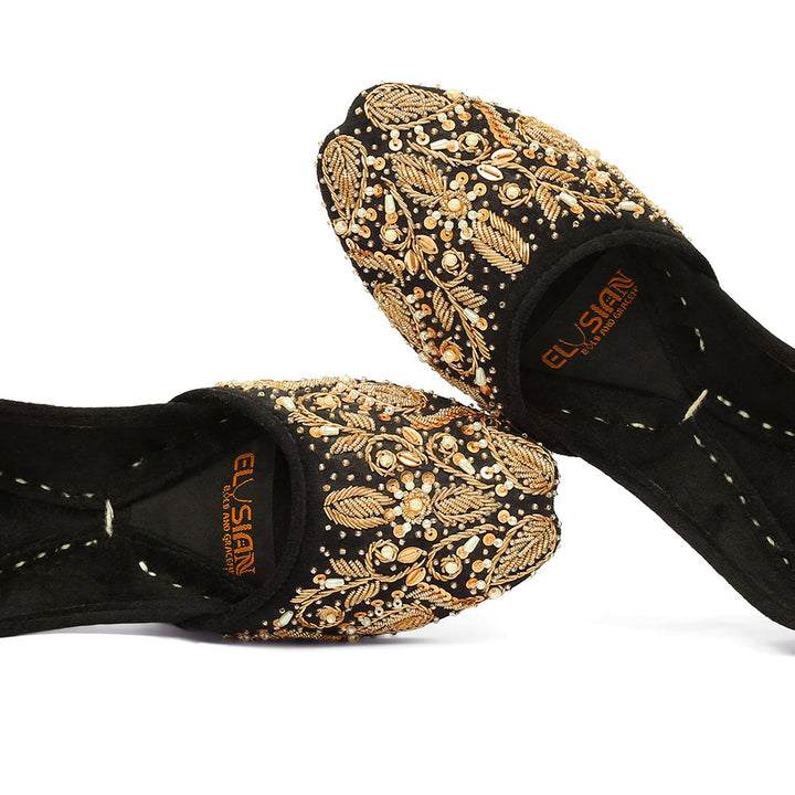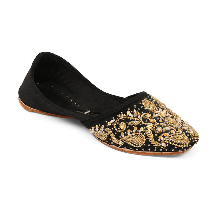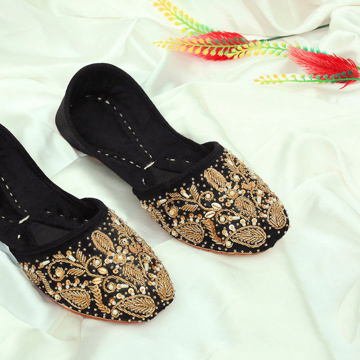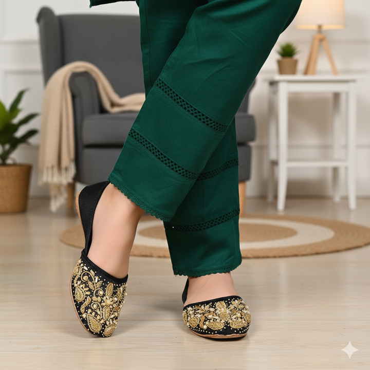 Khussa-AS5-Black perfectly embodies a harmonious blend of luxurious tradition and artistry, set against a captivating black backdrop and adorned with exquisite handcrafted details. These charming treasures, a testament to Pakistan’s heritage, are meticulously hand-sewn by dedicated rural artisans, showcasing the innate beauty of alluring feet.