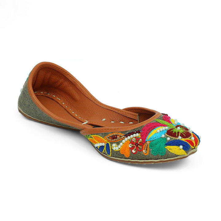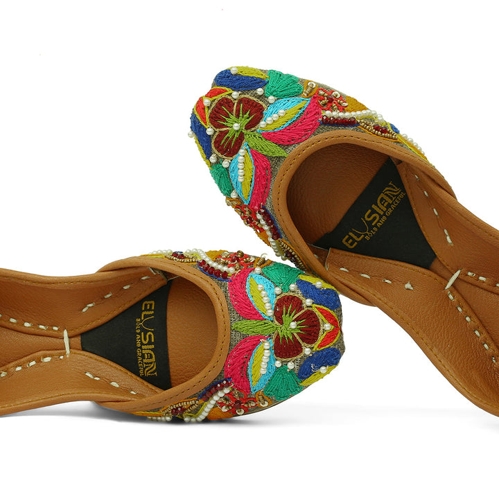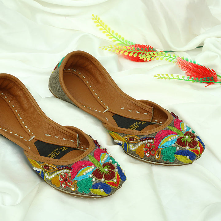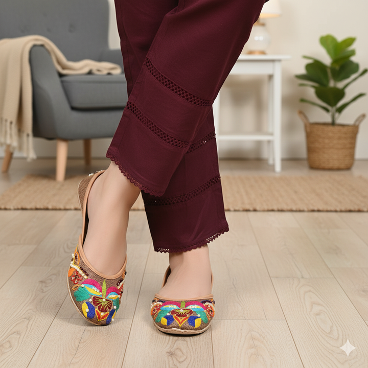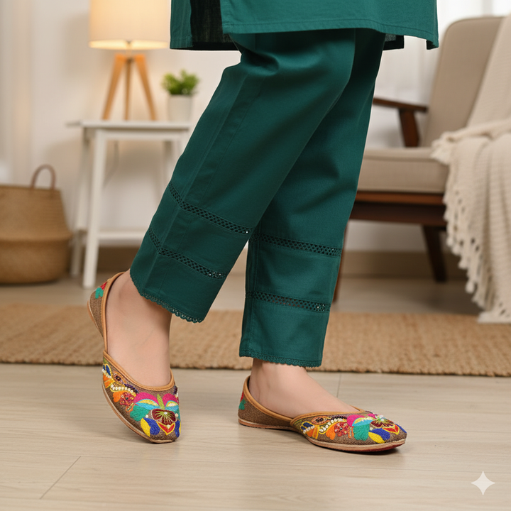 Khussa-AS7-Multi perfectly embodies a harmonious blend of luxurious tradition and artistry, set against a captivating jute backdrop and adorned with exquisite handcrafted details. These charming treasures, a testament to Pakistan’s heritage, are meticulously hand-sewn by dedicated rural artisans, showcasing the innate beauty of alluring feet.