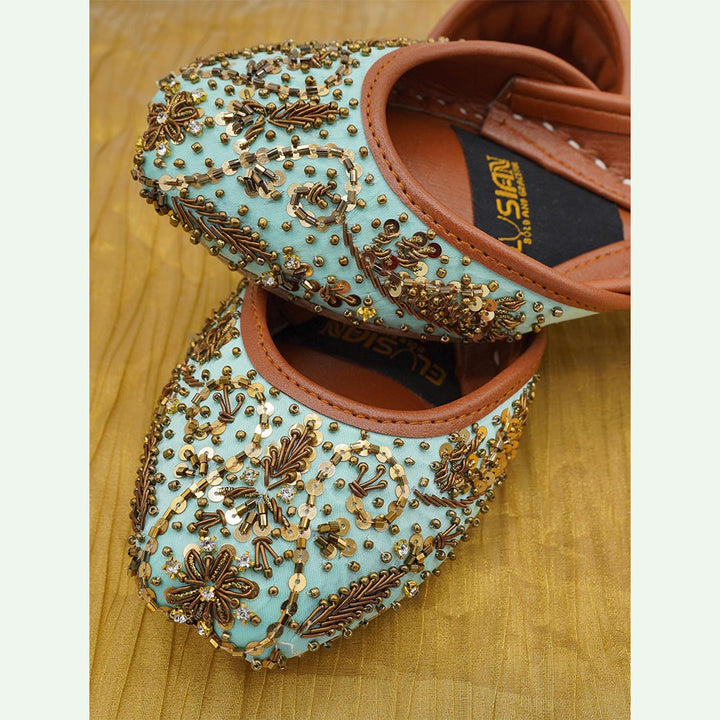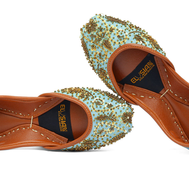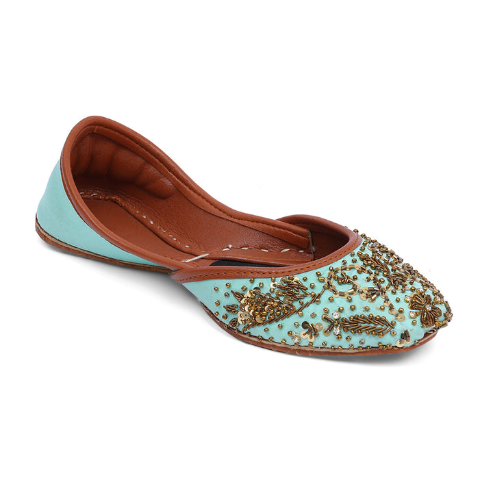 Khussa-B1-Aqua perfectly embodies a harmonious blend of luxurious tradition and artistry, set against a captivating aqua colored backdrop and adorned with exquisite handcrafted details. These charming treasures, a testament to Pakistan’s heritage, are meticulously hand-sewn by dedicated rural artisans, showcasing the innate beauty of alluring feet.