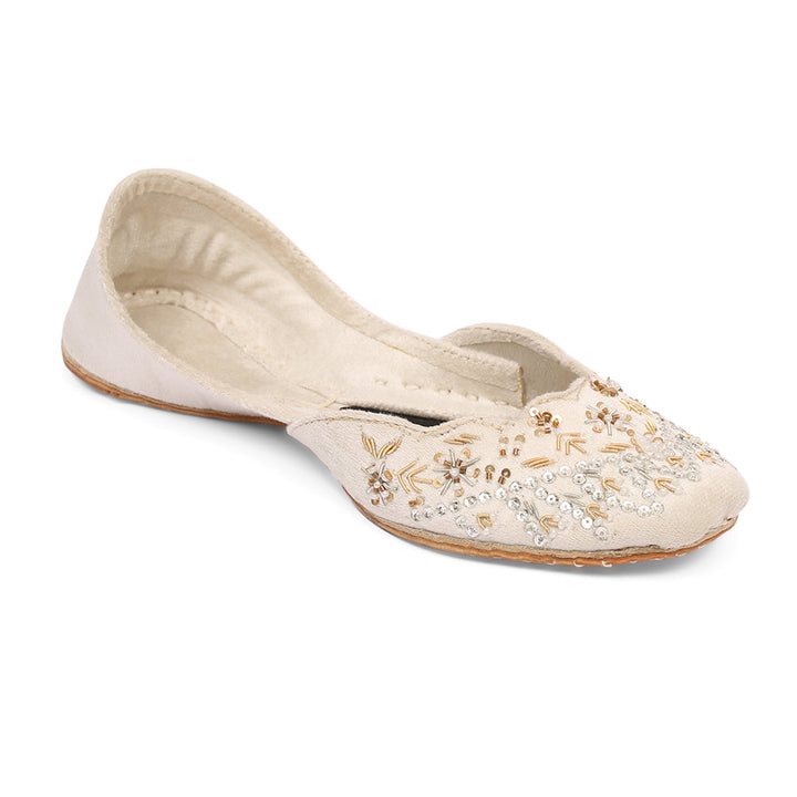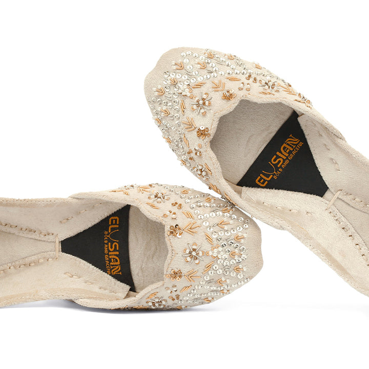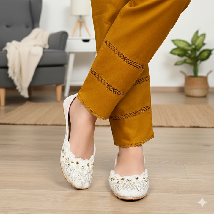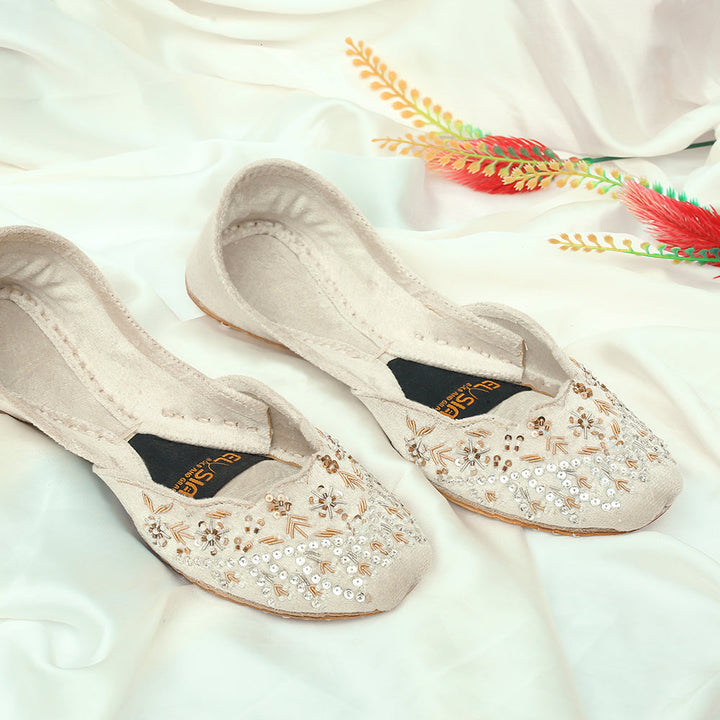 Khussa-EM2-Off-White perfectly embodies a harmonious blend of luxurious tradition and artistry, set against a captivating off ehite backdrop and adorned with exquisite handcrafted details. These charming treasures, a testament to Pakistan’s heritage, are meticulously hand-sewn by dedicated rural artisans, showcasing the innate beauty of alluring feet.
