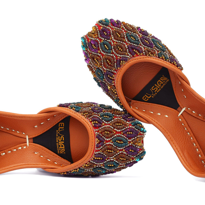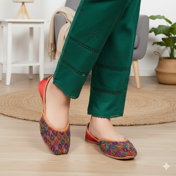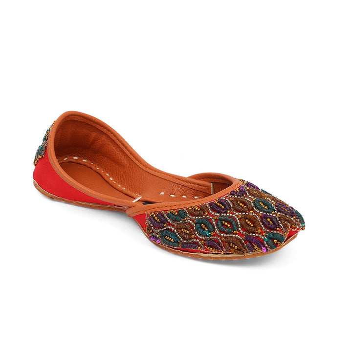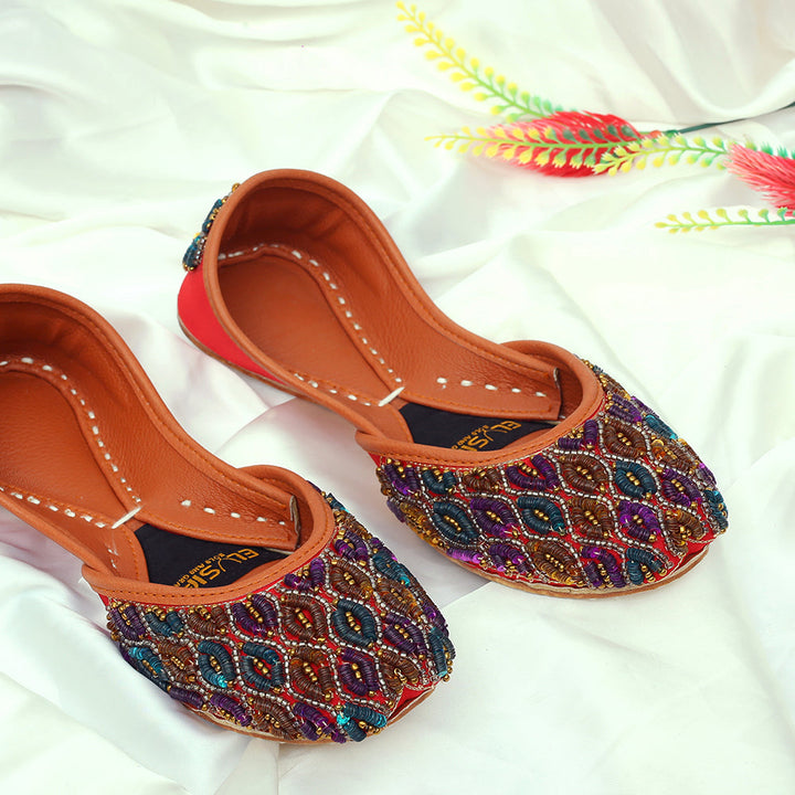 Khussa-IB11-Red(Multi) perfectly embodies a harmonious blend of luxurious tradition and artistry, set against a captivating red backdrop and adorned with exquisite handcrafted details. These charming treasures, a testament to Pakistan’s heritage, are meticulously hand-sewn by dedicated rural artisans, showcasing the innate beauty of alluring feet.