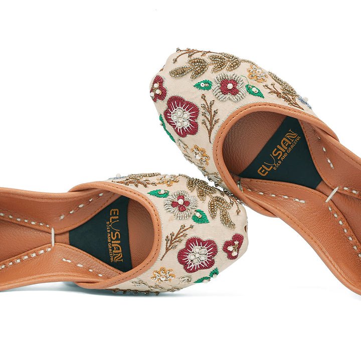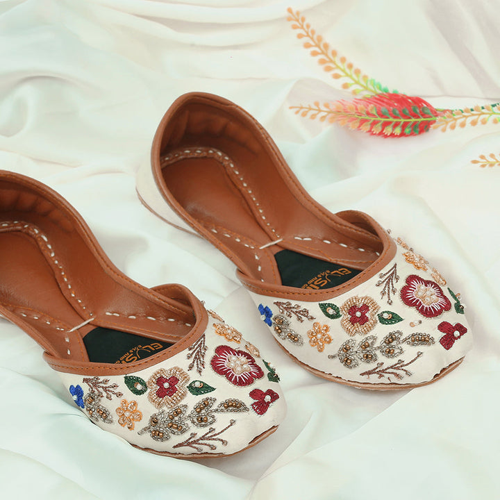Khussa-IB7-Off-White perfectly embodies a harmonious blend of luxurious tradition and artistry, set against a captivating off-white backdrop and adorned with exquisite handcrafted details. These charming treasures, a testament to Pakistan’s heritage, are meticulously hand-sewn by dedicated rural artisans, showcasing the innate beauty of alluring feet.
