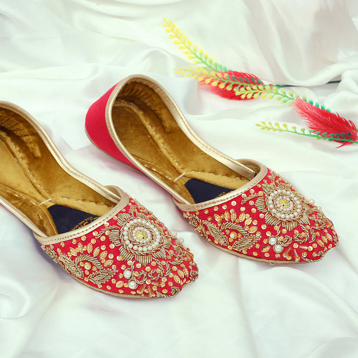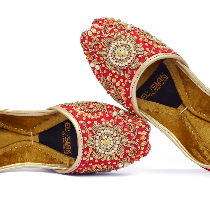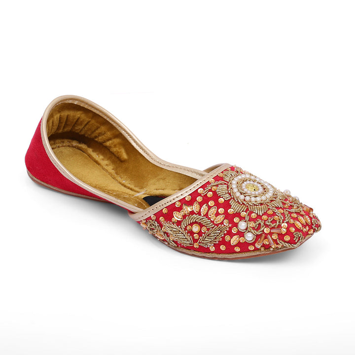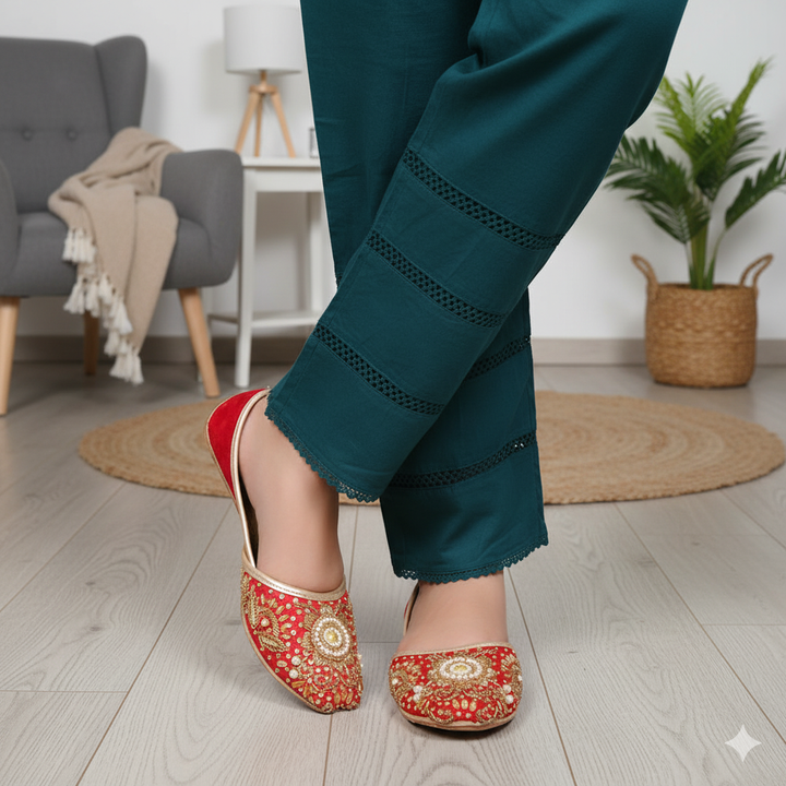 Khussa-Q2-Red perfectly embodies a harmonious blend of luxurious tradition and artistry, set against a captivating red backdrop and adorned with exquisite handcrafted details. These charming treasures, a testament to Pakistan’s heritage, are meticulously hand-sewn by dedicated rural artisans, showcasing the innate beauty of alluring feet.