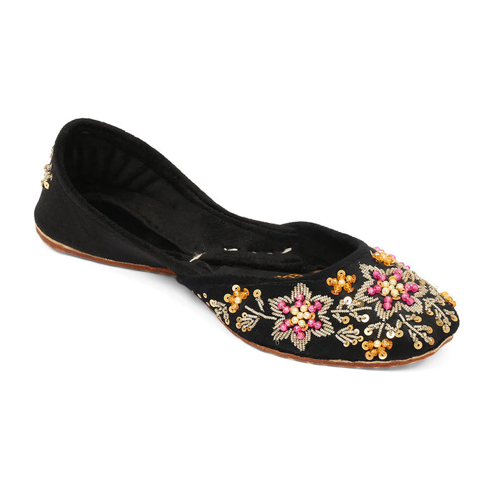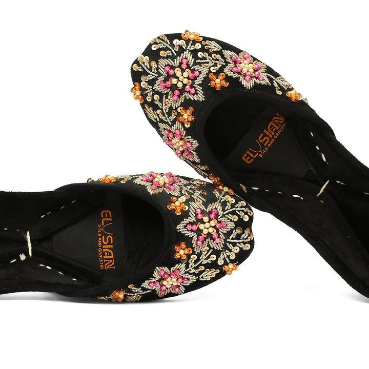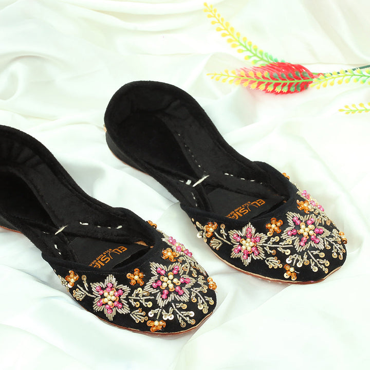 Khussa-SJ1-Black perfectly embodies a harmonious blend of luxurious tradition and artistry, set against a captivating black backdrop and adorned with exquisite handcrafted details. These charming treasures, a testament to Pakistan’s heritage, are meticulously hand-sewn by dedicated rural artisans, showcasing the innate beauty of alluring feet.