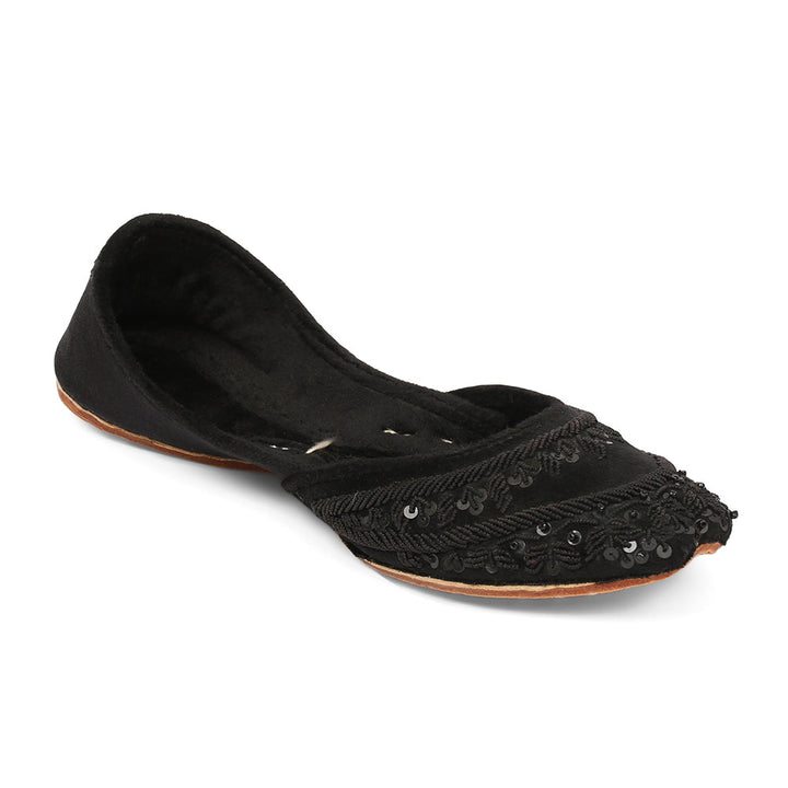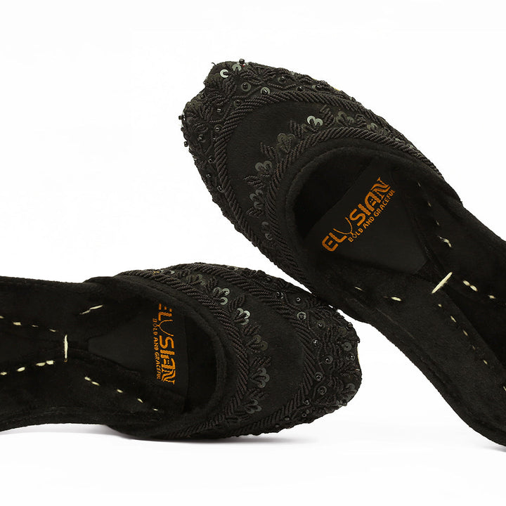 Khussa-SJ6-Black perfectly embodies a harmonious blend of luxurious tradition and artistry, set against a captivating black backdrop and adorned with exquisite handcrafted details. These charming treasures, a testament to Pakistan’s heritage, are meticulously hand-sewn by dedicated rural artisans, showcasing the innate beauty of alluring feet.