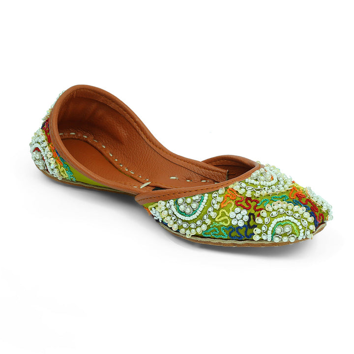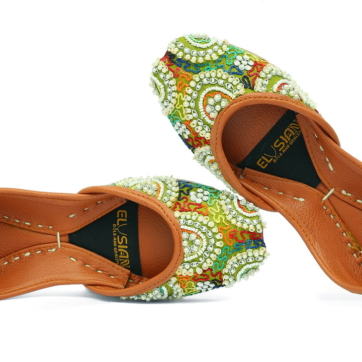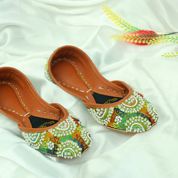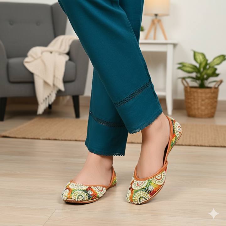 Khussa-SJ7-Dhani perfectly embodies a harmonious blend of luxurious tradition and artistry, set against a captivating dhani backdrop and adorned with exquisite handcrafted details. These charming treasures, a testament to Pakistan’s heritage, are meticulously hand-sewn by dedicated rural artisans, showcasing the innate beauty of alluring feet.