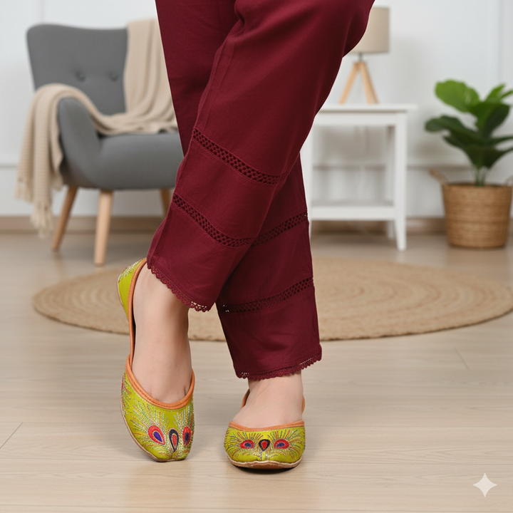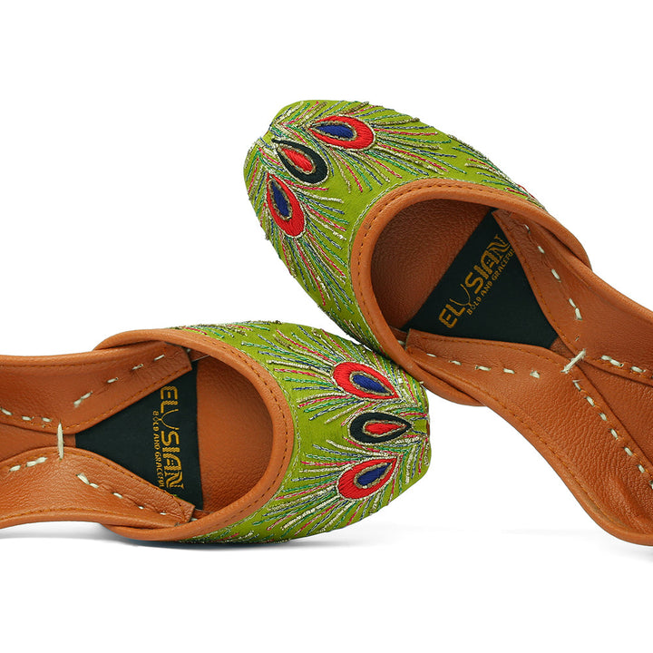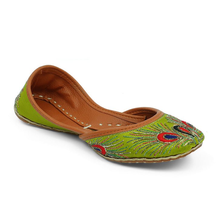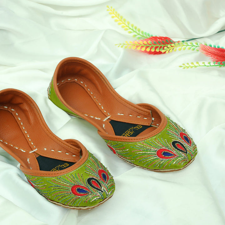 Khussa-WS3-Dhani perfectly embodies a harmonious blend of luxurious tradition and artistry, set against a captivating green backdrop and adorned with exquisite handcrafted details. These charming treasures, a testament to Pakistan’s heritage, are meticulously hand-sewn by dedicated rural artisans, showcasing the innate beauty of alluring feet.