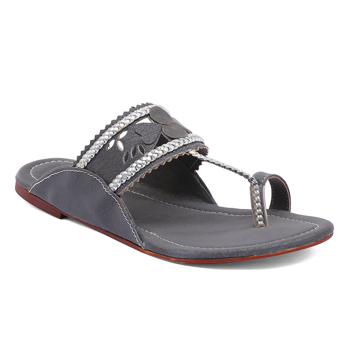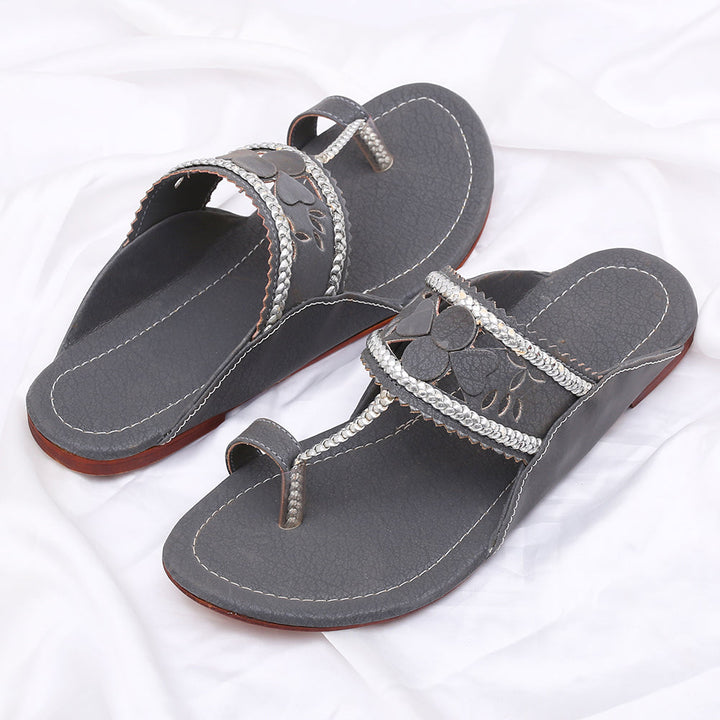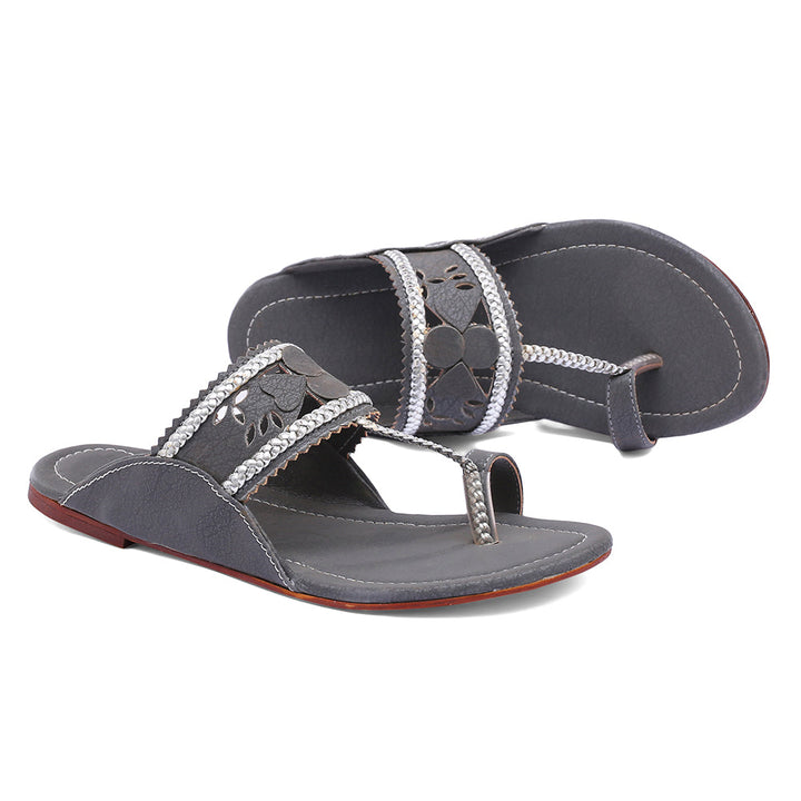 KL-IR3-Grey represents a prime and outstanding example of Kolhapuri footwear, characterized by its delightful, opulent, and traditional craftsmanship. Crafted on a grey foundation, these shoes showcase intricate handmade embellishments. These remarkable creations are cherished cultural artifacts of Pakistan, meticulously stitched by dedicated cobblers from rural communities, showcasing the unparalleled elegance designed to adorn and enhance the allure of one’s feet.