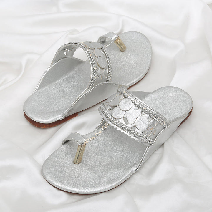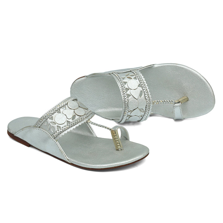 KL-IR6-Silver represents a prime and outstanding example of Kolhapuri footwear, characterized by its delightful, opulent, and traditional craftsmanship. Crafted on a silver foundation, these shoes showcase intricate handmade embellishments. These remarkable creations are cherished cultural artifacts of Pakistan, meticulously stitched by dedicated cobblers from rural communities, showcasing the unparalleled elegance designed to adorn and enhance the allure of one’s feet.