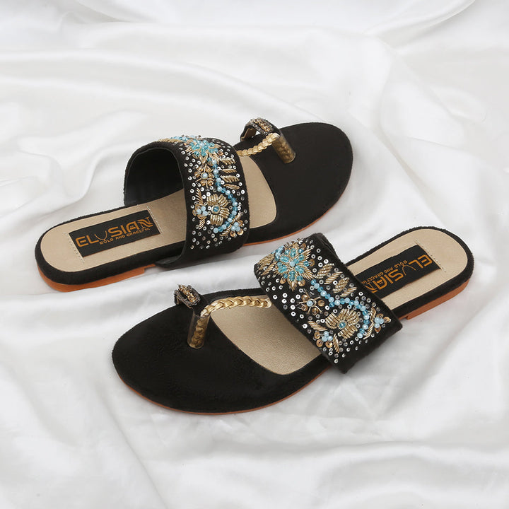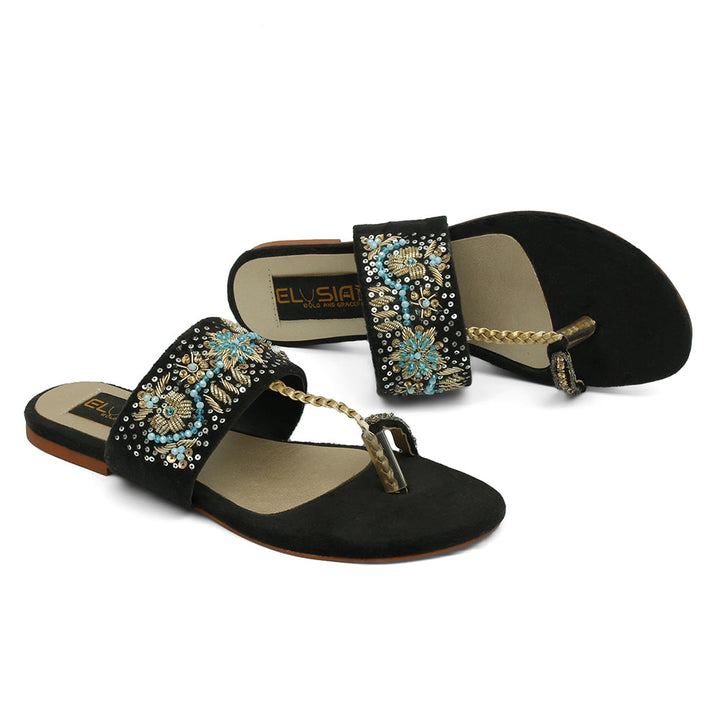KL-K1-Black represents a prime and outstanding example of Kolhapuri footwear, characterized by its delightful, opulent, and traditional craftsmanship. Crafted on a foundation of black velvet, these shoes showcase intricate handmade embellishments. These remarkable creations are cherished cultural artifacts of Pakistan, meticulously stitched by dedicated cobblers from rural communities, showcasing the unparalleled elegance designed to adorn and enhance the allure of one’s feet.