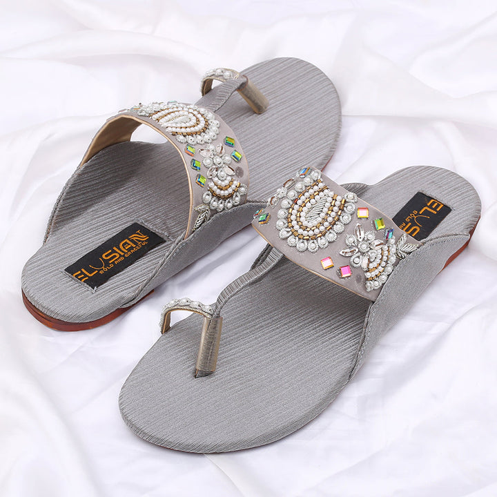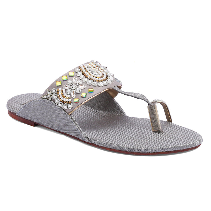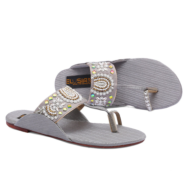KL-KH2-Grey represents a prime and outstanding example of Kolhapuri footwear, characterized by its delightful, opulent, and traditional craftsmanship. Crafted on a foundation of grey, these shoes showcase intricate handmade embellishments. These remarkable creations are cherished cultural artifacts of Pakistan, meticulously stitched by dedicated cobblers from rural communities, showcasing the unparalleled elegance designed to adorn and enhance the allure of one’s feet.
