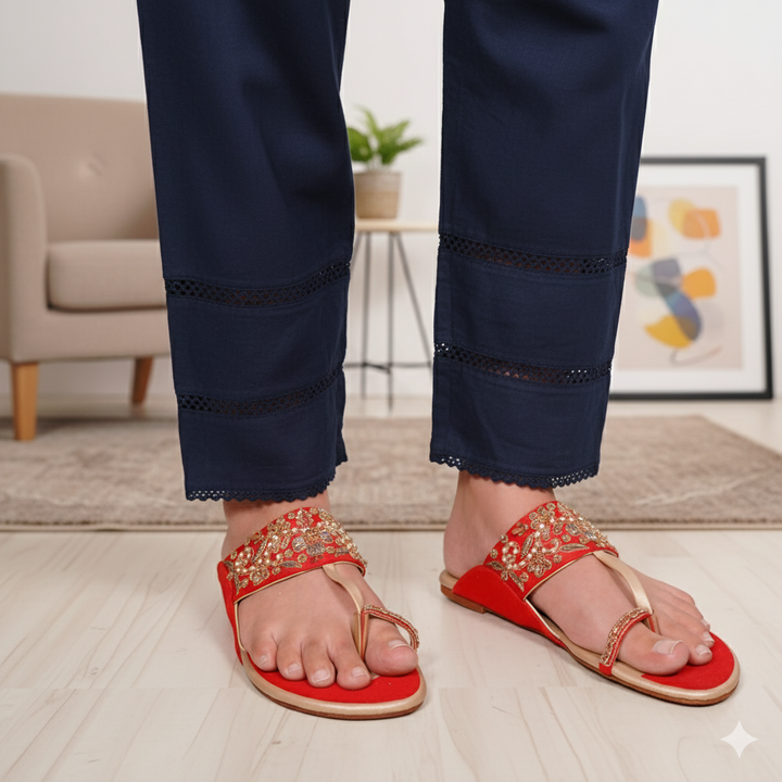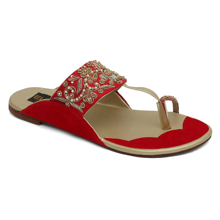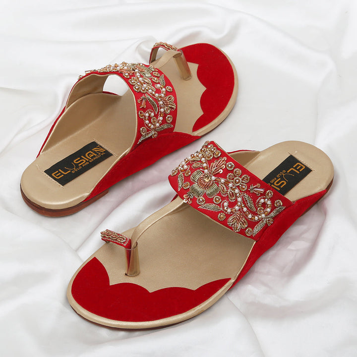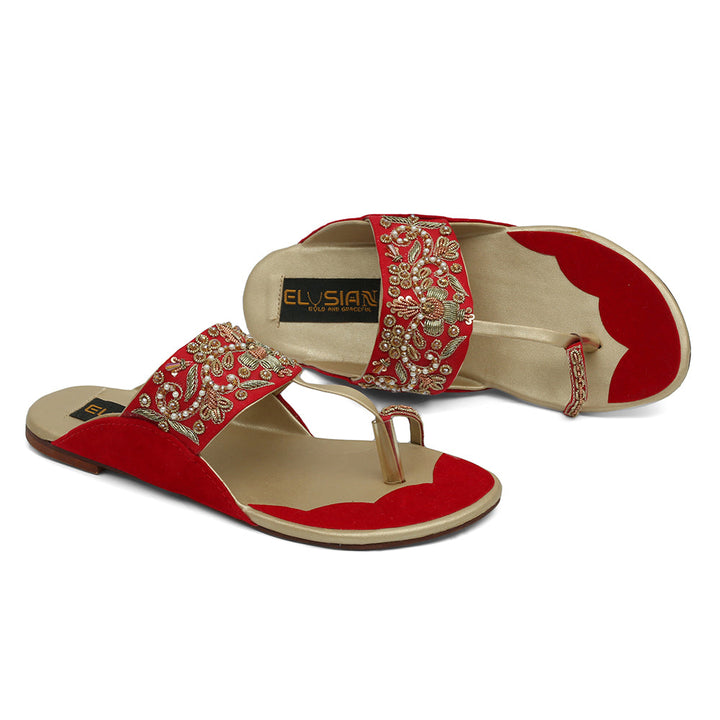 KL-KH2-Red represents a prime and outstanding example of Kolhapuri footwear, characterized by its delightful, opulent, and traditional craftsmanship. Crafted on a foundation of red, these shoes showcase intricate handmade embellishments. These remarkable creations are cherished cultural artifacts of Pakistan, meticulously stitched by dedicated cobblers from rural communities, showcasing the unparalleled elegance designed to adorn and enhance the allure of one’s feet.