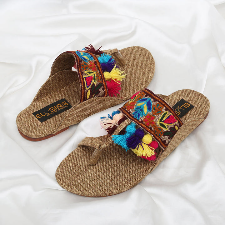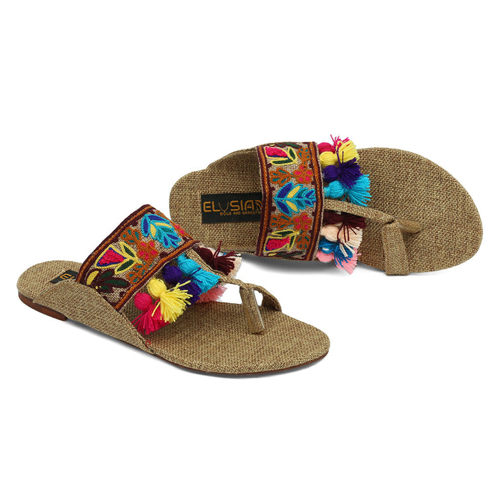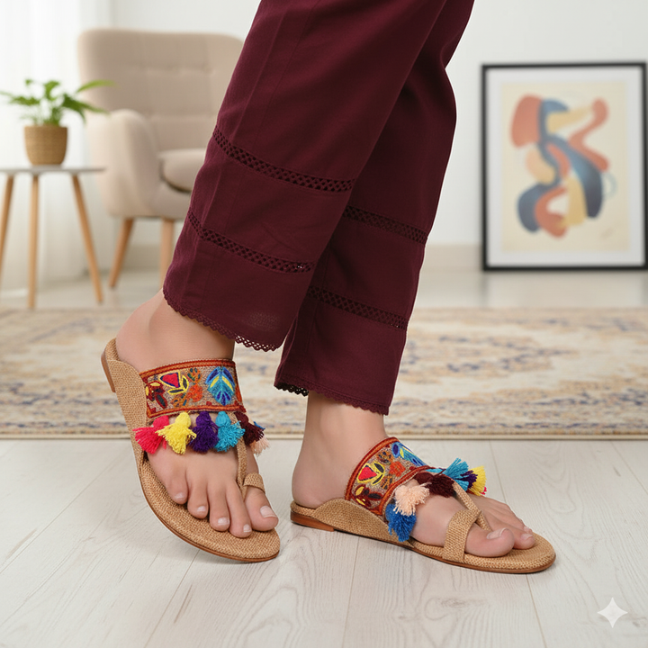 KL-SJ2-Fawn represents a prime and outstanding example of Kolhapuri footwear, characterized by its delightful, opulent, and traditional craftsmanship. Crafted on a foundation of fawn jute, these shoes showcase intricate handmade embellishments. These remarkable creations are cherished cultural artifacts of Pakistan, meticulously stitched by dedicated cobblers from rural communities, showcasing the unparalleled elegance designed to adorn and enhance the allure of one’s feet.