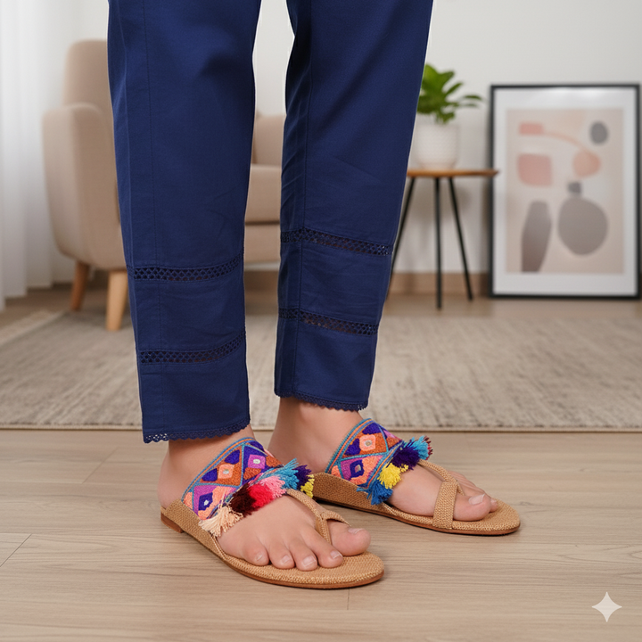 KL-SJ4-Fawn represents a prime and outstanding example of Kolhapuri footwear, characterized by its delightful, opulent, and traditional craftsmanship. Crafted on a foundation of fawn jute, these shoes showcase intricate handmade embellishments. These remarkable creations are cherished cultural artifacts of Pakistan, meticulously stitched by dedicated cobblers from rural communities, showcasing the unparalleled elegance designed to adorn and enhance the allure of one’s feet.