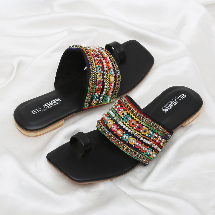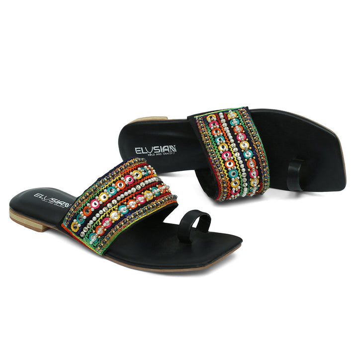 KL-WS3-Black represents a prime and outstanding example of Kolhapuri footwear, characterized by its delightful, opulent, and traditional craftsmanship. Crafted on a foundation of black velvet, these shoes showcase intricate handmade embellishments. These remarkable creations are cherished cultural artifacts of Pakistan, meticulously stitched by dedicated cobblers from rural communities, showcasing the unparalleled elegance designed to adorn and enhance the allure of one’s feet.