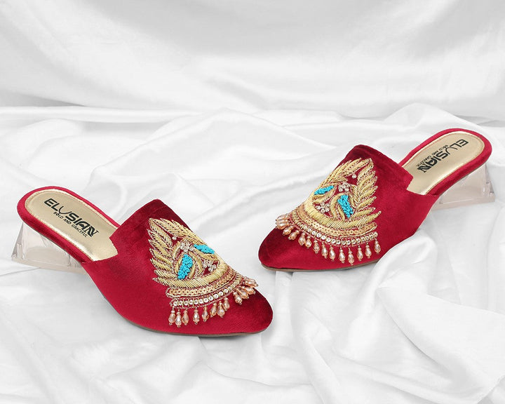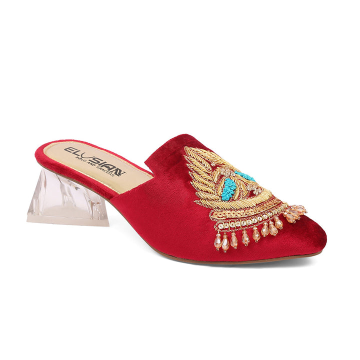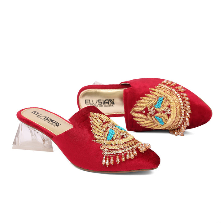 ML-AE3-Mighty-Moon--Red-(Heel) stands as a true embodiment of delightful, opulent, and timeless artistry, crafted upon a rich red velvet foundation and adorned with a captivating blend of intricate embroidery. These treasured symbols of Pakistan’s heritage are meticulously hand-sewn by dedicated shoemakers from rural regions, proudly showcasing the exquisite allure of captivating feet.