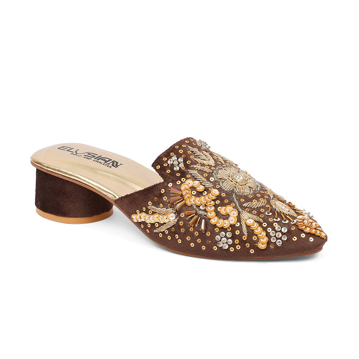 ML-AQ1-Brown-(Heel) stands as a true embodiment of delightful, opulent, and timeless artistry, crafted upon a rich brown velvet foundation and adorned with a captivating blend of intricate embroidery. These treasured symbols of Pakistan’s heritage are meticulously hand-sewn by dedicated shoemakers from rural regions, proudly showcasing the exquisite allure of captivating feet.