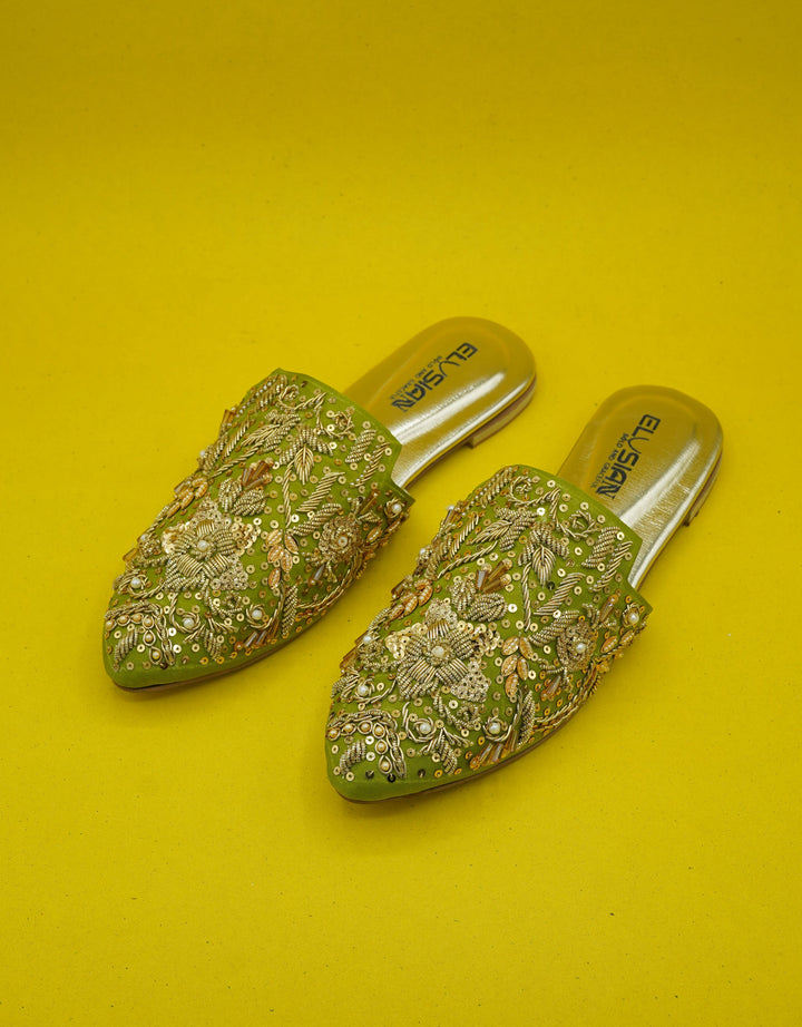 ML-AS8-Dhani stands as a true embodiment of delightful, opulent, and timeless artistry, crafted upon a rich green foundation and adorned with a captivating blend of intricate embroidery. These treasured symbols of Pakistan’s heritage are meticulously hand-sewn by dedicated shoemakers from rural regions, proudly showcasing the exquisite allure of captivating feet.