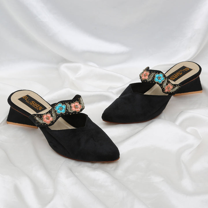 ML-IF8-Black (Heel) stands as a true embodiment of delightful, opulent, and timeless artistry, crafted with a rich black velvet foundation and adorned with a captivating blend of intricate embroidery. These treasured symbols of Pakistan’s heritage are meticulously hand-sewn by dedicated shoemakers from rural regions, proudly showcasing the exquisite allure of captivating feet.