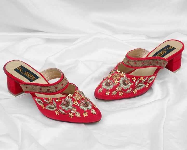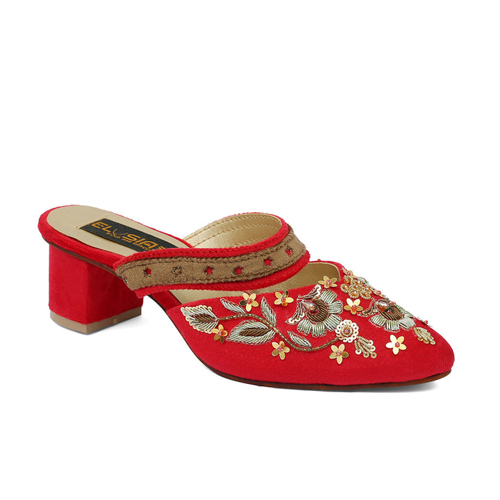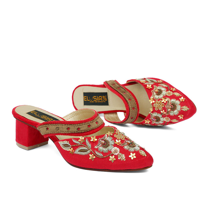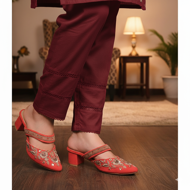 ML-K2-Red (Heel) stands as a true embodiment of delightful, opulent, and timeless artistry, crafted upon a rich red velvet foundation and adorned with a captivating blend of intricate embroidery. These treasured symbols of Pakistan’s heritage are meticulously hand-sewn by dedicated shoemakers from rural regions, proudly showcasing the exquisite allure of captivating feet.
