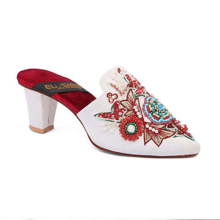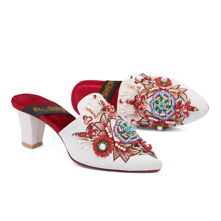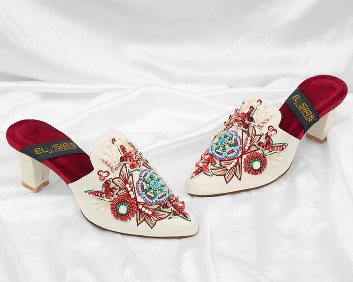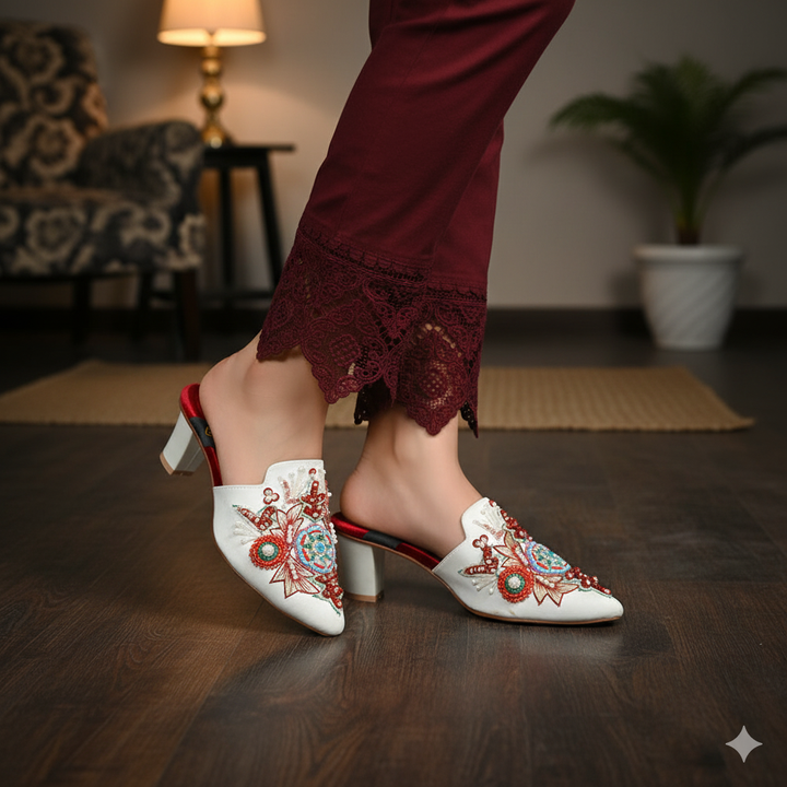 ML-Q3-O.White-(Heel) stands as a true embodiment of delightful, opulent, and timeless artistry, crafted upon a rich off white foundation and adorned with a captivating blend of intricate embroidery. These treasured symbols of Pakistan’s heritage are meticulously hand-sewn by dedicated shoemakers from rural regions, proudly showcasing the exquisite allure of captivating feet.