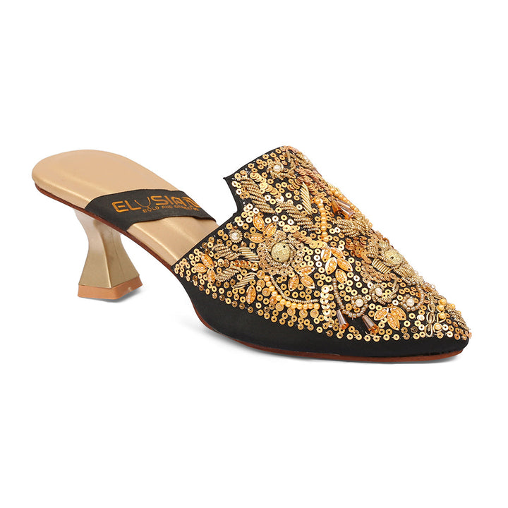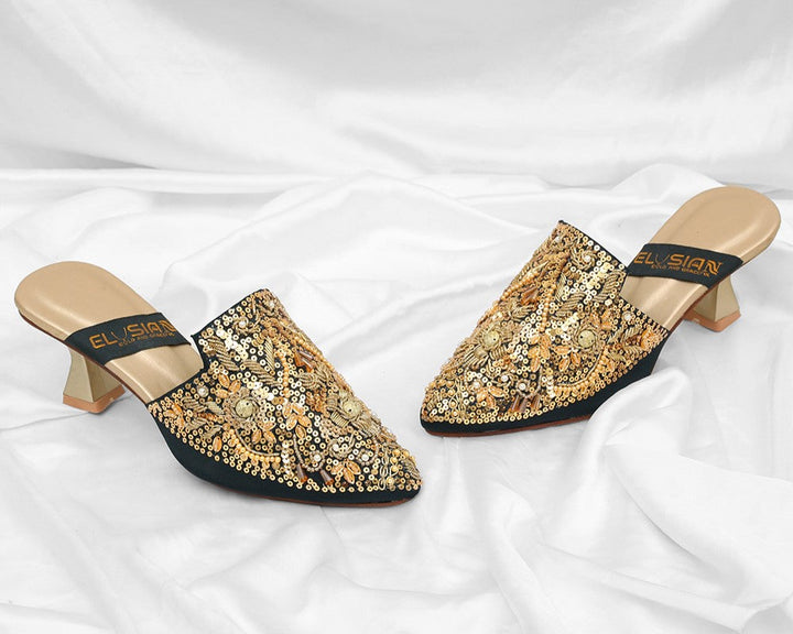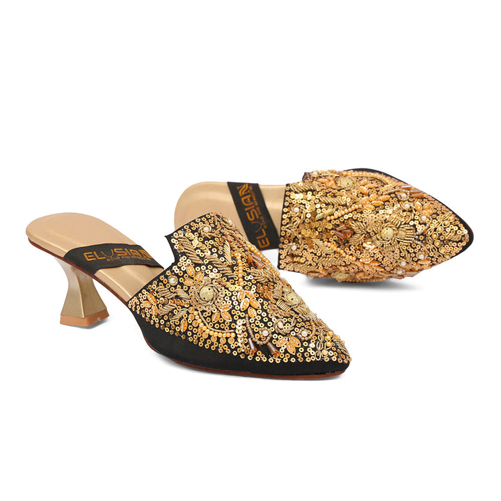 ML-Q4-Black-(Heel) stands as a true embodiment of delightful, opulent, and timeless artistry, crafted upon a rich black foundation and adorned with a captivating blend of intricate embroidery. These treasured symbols of Pakistan’s heritage are meticulously hand-sewn by dedicated shoemakers from rural regions, proudly showcasing the exquisite allure of captivating feet.