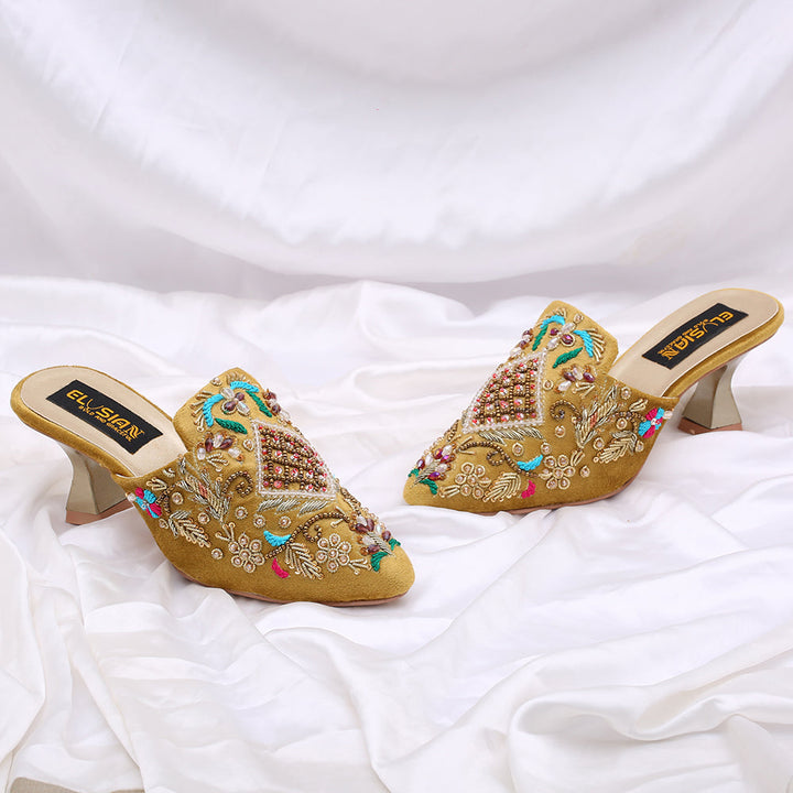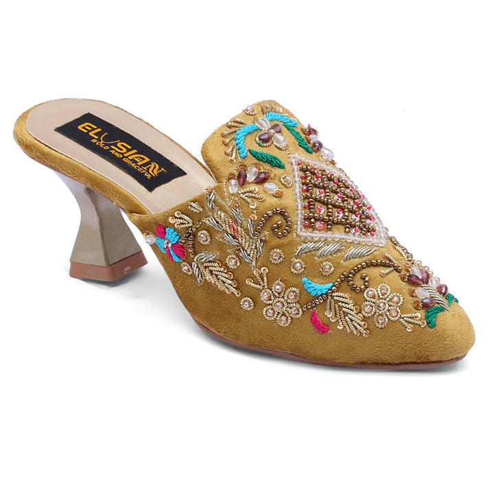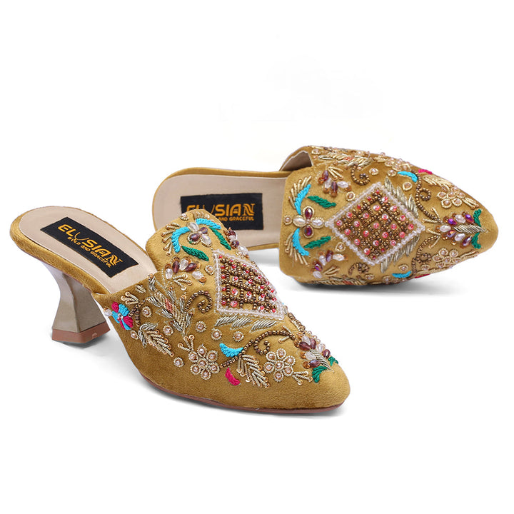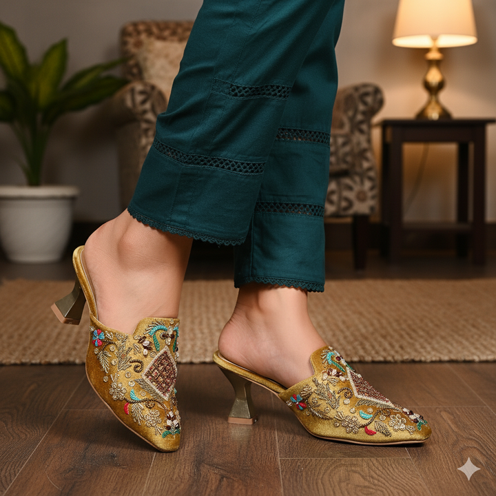 ML-S7-Golden embodies delightful, opulent, and timeless artistry, crafted upon a rich golden foundation and adorned with a captivating blend of intricate embroidery. These treasured symbols of Pakistan’s heritage are meticulously hand-sewn by dedicated shoemakers from rural regions, proudly showcasing the exquisite allure of captivating feet.