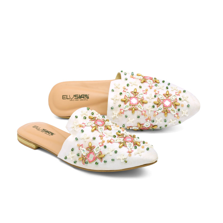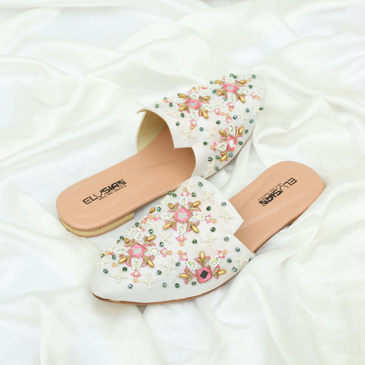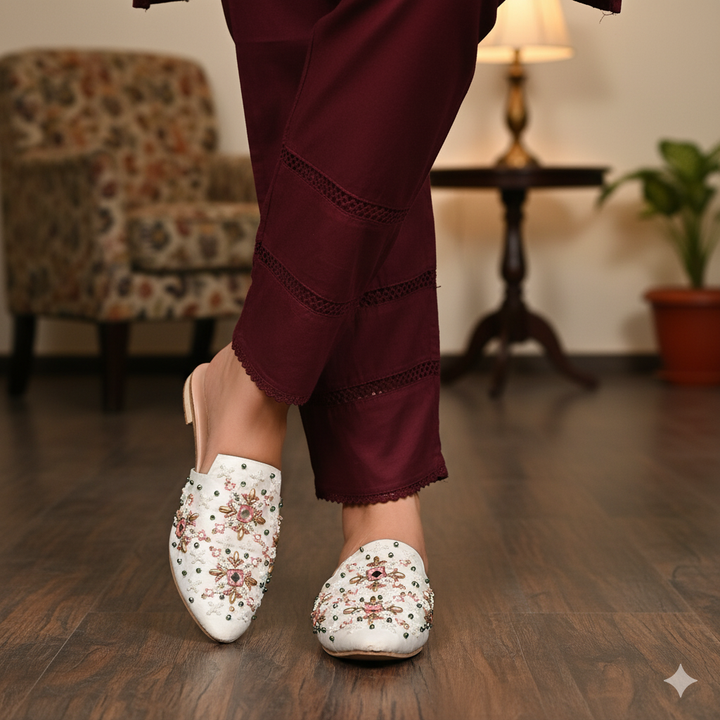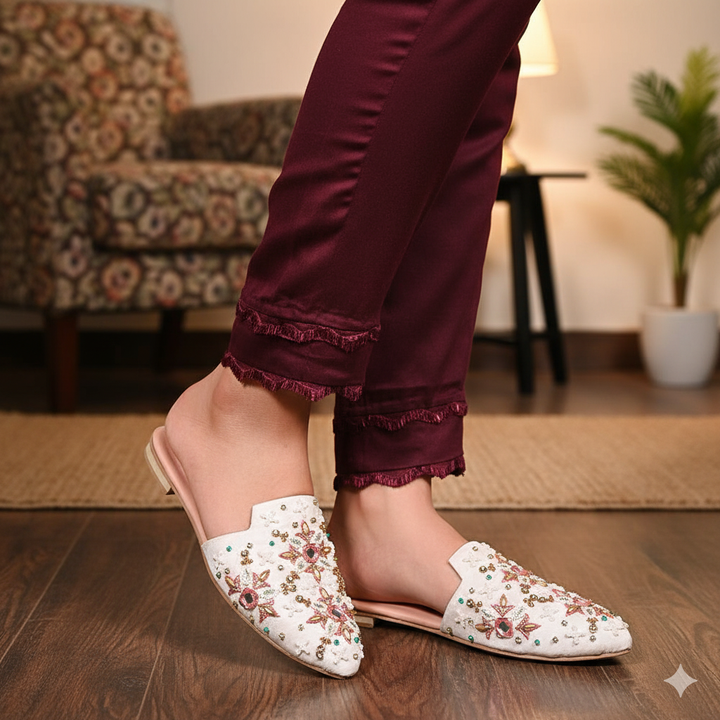 ML-WS7-Off White stands as a true embodiment of delightful, opulent, and timeless artistry, crafted upon an Off-White foundation and adorned with a captivating blend of intricate embroidery. These treasured symbols of Pakistan’s heritage are meticulously hand-sewn by dedicated shoemakers from rural regions, proudly showcasing the exquisite allure of captivating feet.