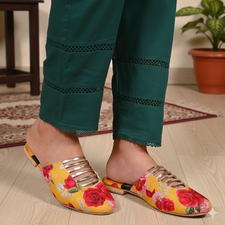 Explore the irresistible allure of Elysian's Printed Mules! These remarkable mules blend opulence and heritage effortlessly, featuring vibrant printed designs inspired by Pakistan's rich cultural tapestry. Crafted with precision by talented rural artisans, each pair reflects meticulous artistry and enhances the natural grace of your feet. Elevate your fashion statement with sophistication and cultural flair with our printed mules! They are a must-have for your seasonal closet.
